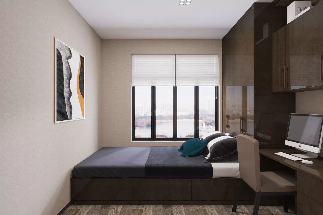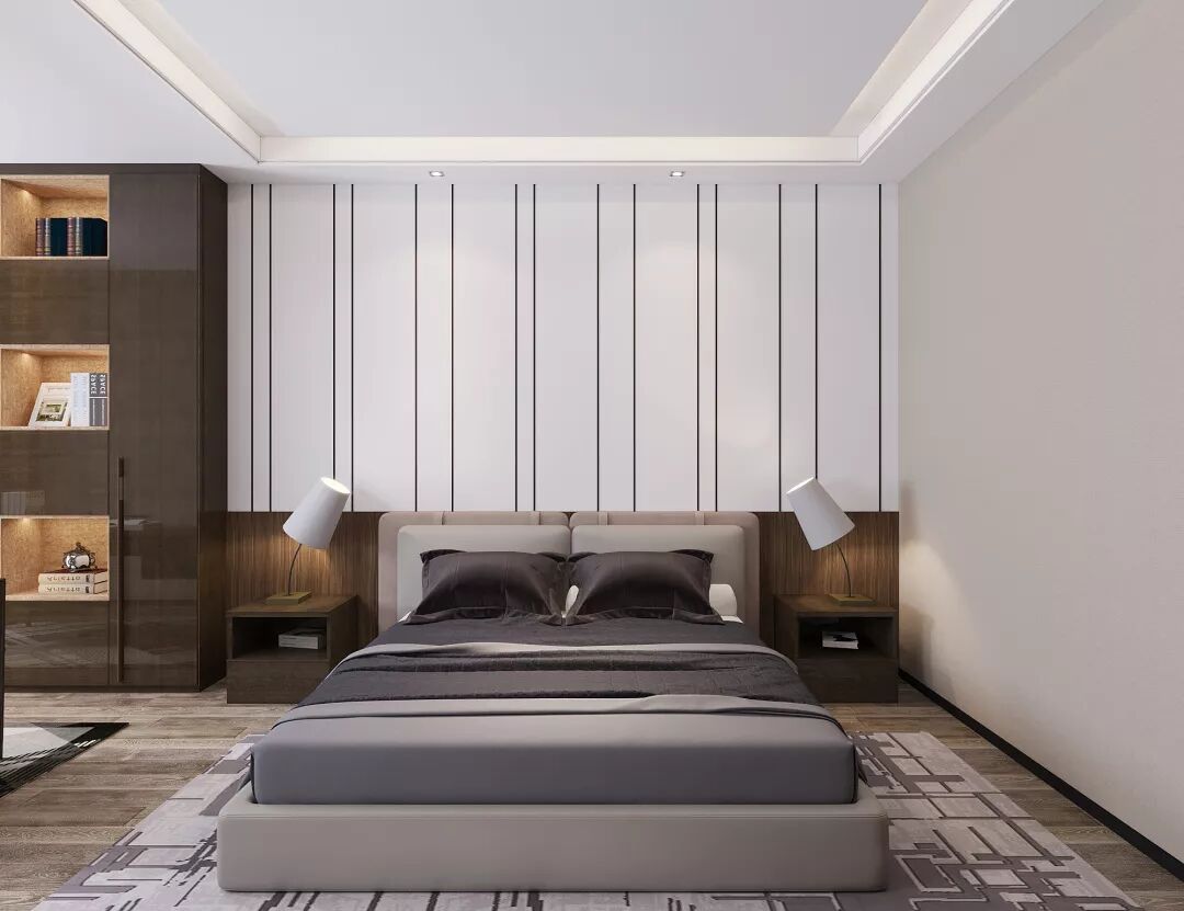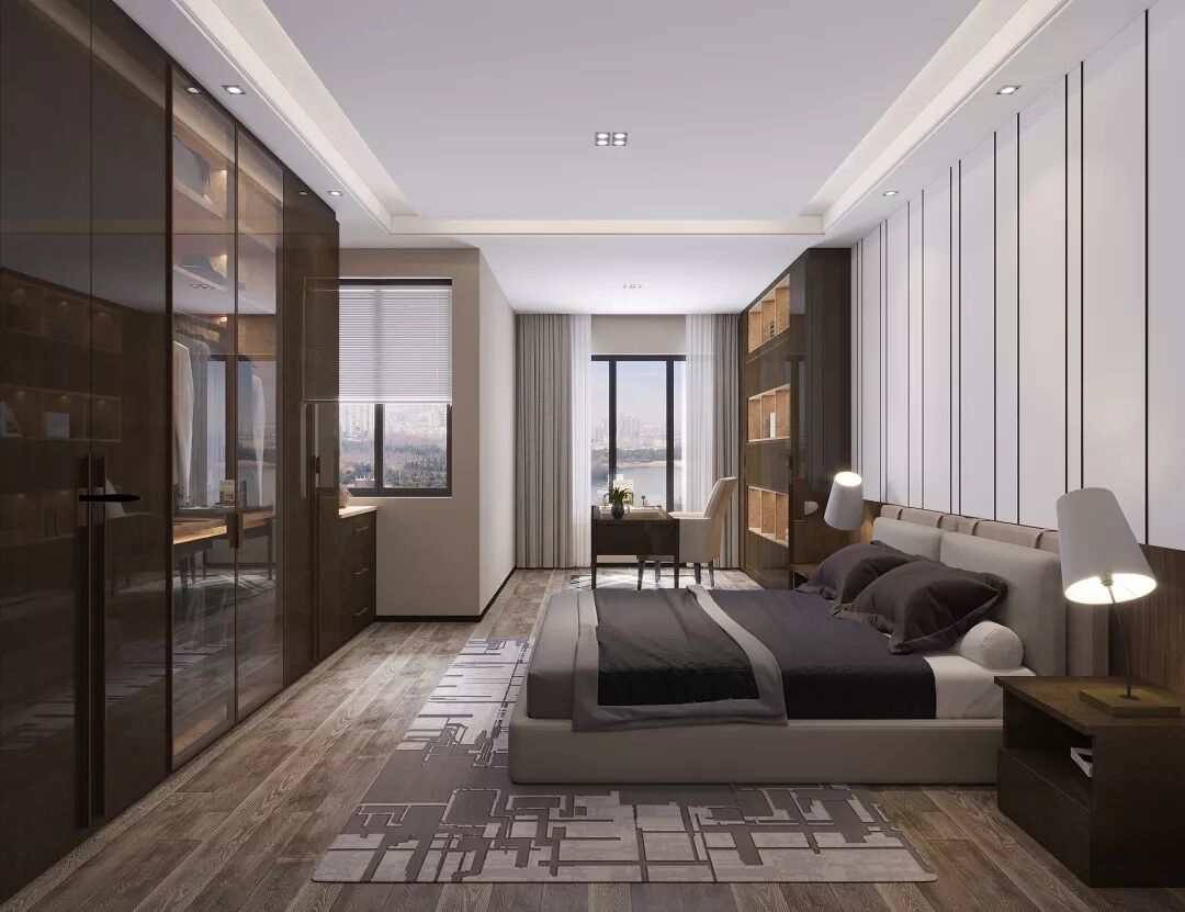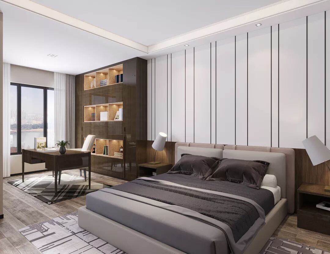 现代气息非常浓厚的主卧空间该是很多人都会喜欢的风格吧?条纹背景墙十分干净舒适,视觉上也因为色调的转换而得到缓和。卧室内设立了独立书房,在休息之余也偶尔沉浸在书海中,生活就该这样惬意!