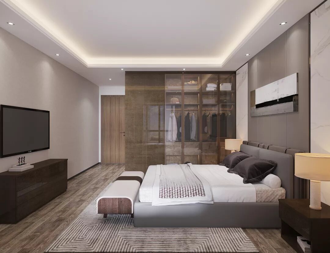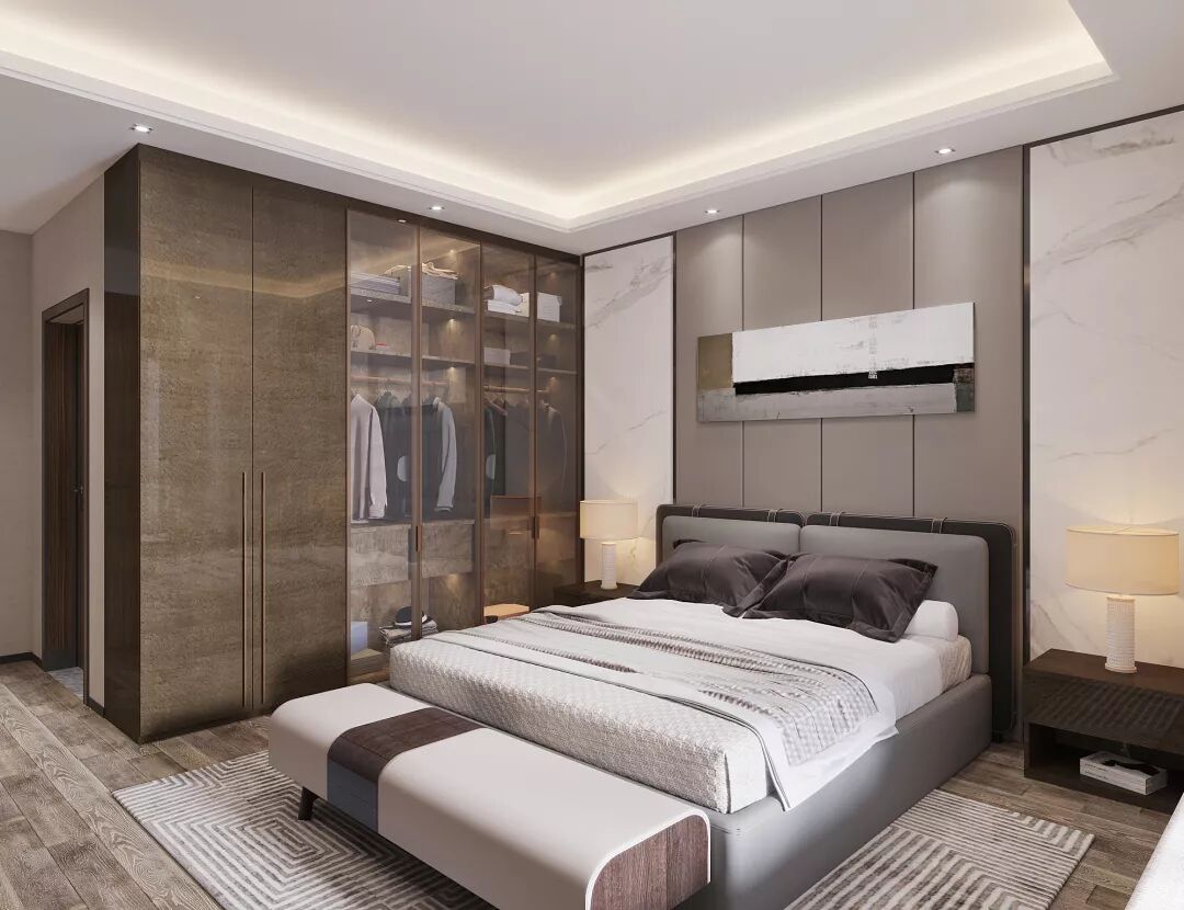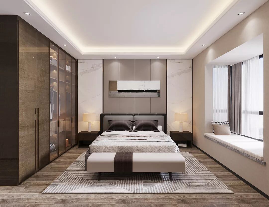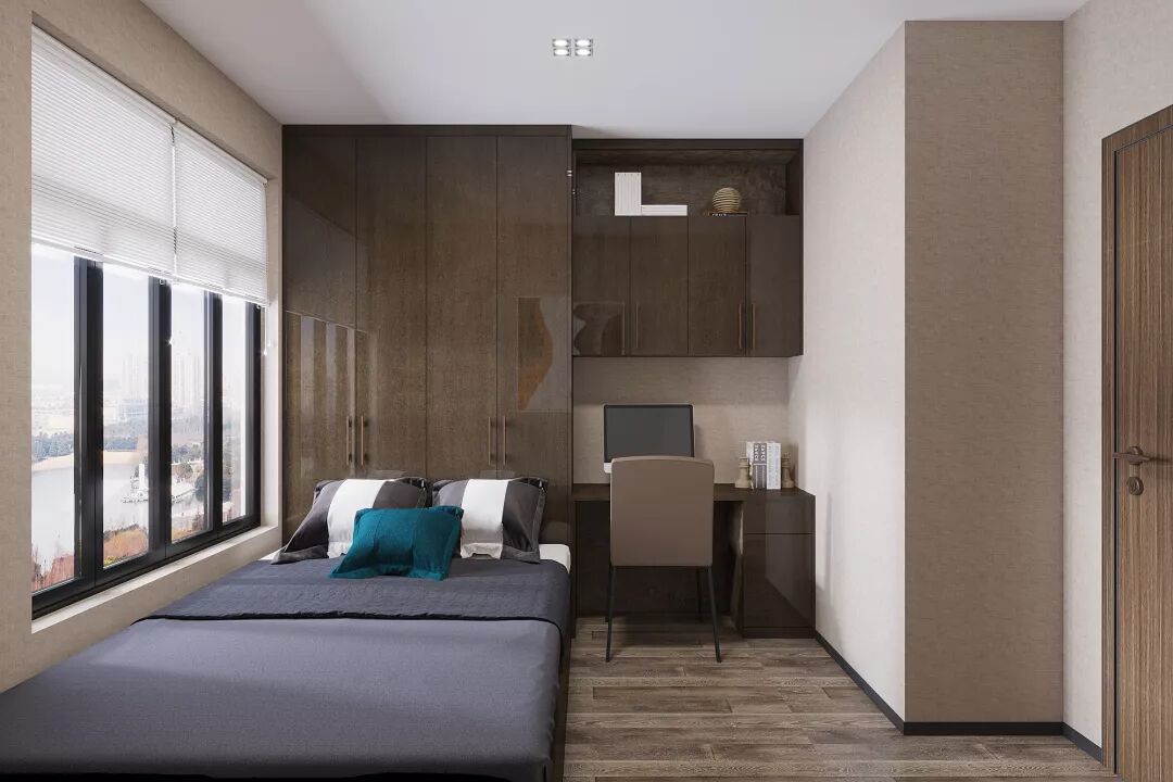 现代气息非常浓厚的主卧空间该是很多人都会喜欢的风格吧?条纹背景墙十分干净舒适,视觉上也因为色调的转换而得到缓和。卧室内设立了独立书房,在休息之余也偶尔沉浸在书海中,生活就该这样惬意!