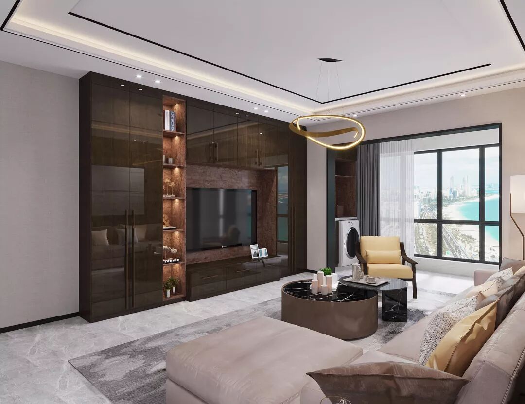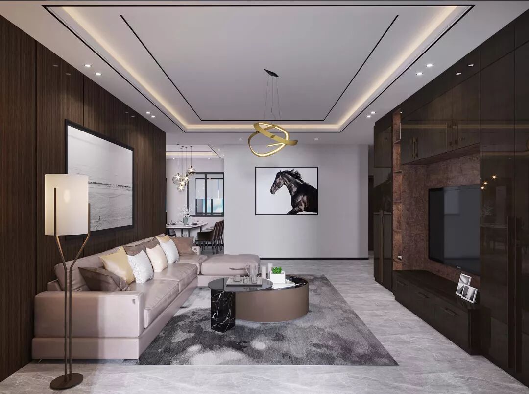 尊贵高档的棕色调让空间显得更加奢华,透亮的电视柜体烤漆门板与墙面的沉稳色调相呼应。极富现代设计感的吊灯符合都市人的追求,简约大气,与整个客厅的氛围十分融洽。