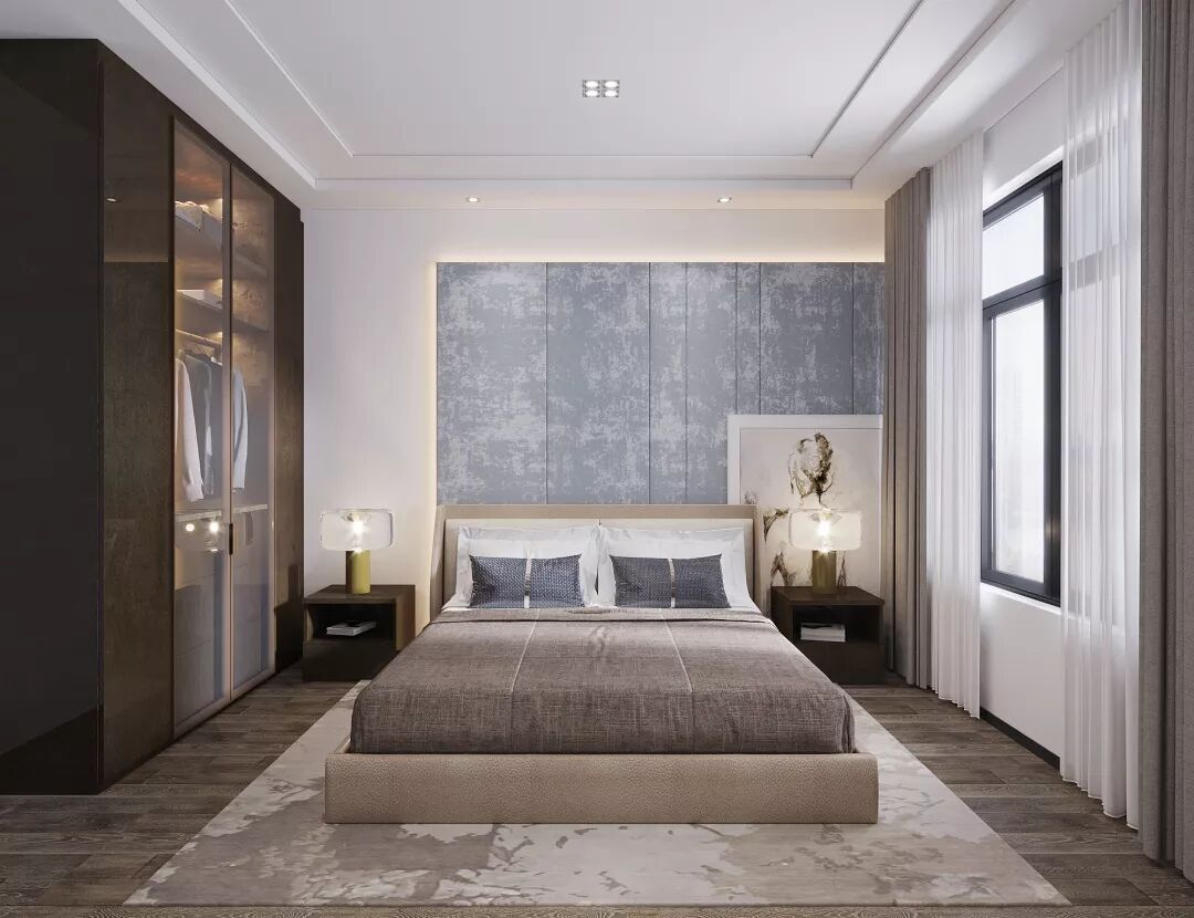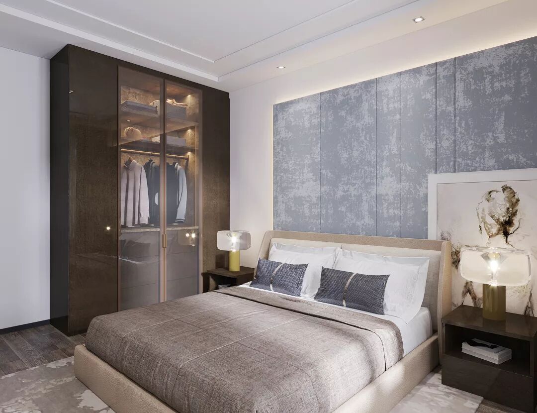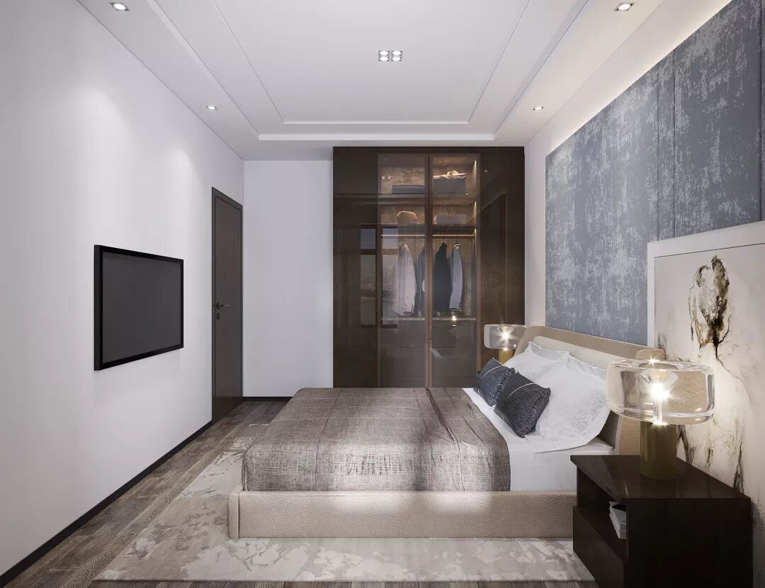 次卧这一抹灰蓝让人眼前一亮。富有艺术气息的背景墙面与空间融合,与主卧的格调不同,这间次卧尊贵中带着一种素雅气息。