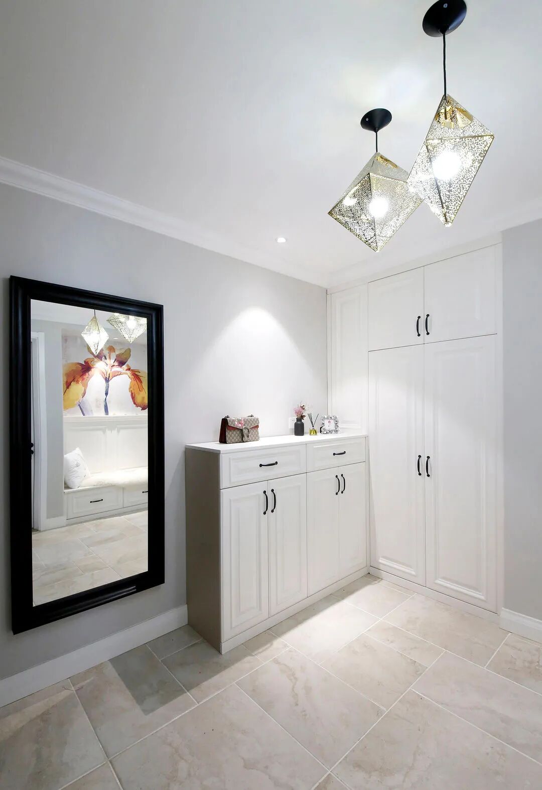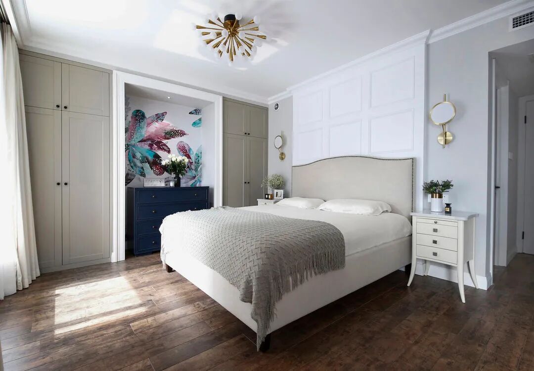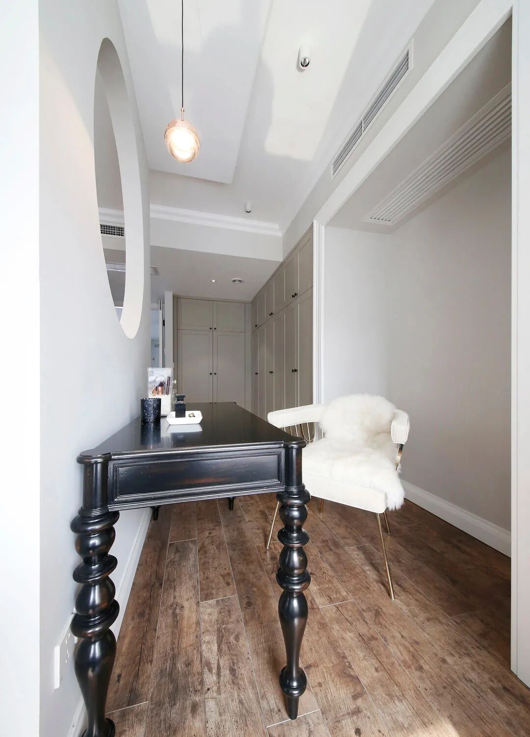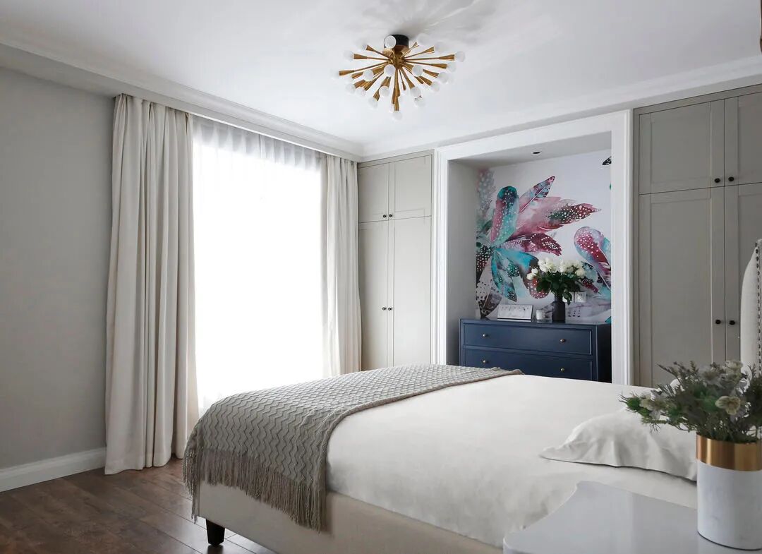 靠墙大衣柜存在感比较弱,不显堵,同时拿出中间一部分空间做装饰点缀,丰富视觉。