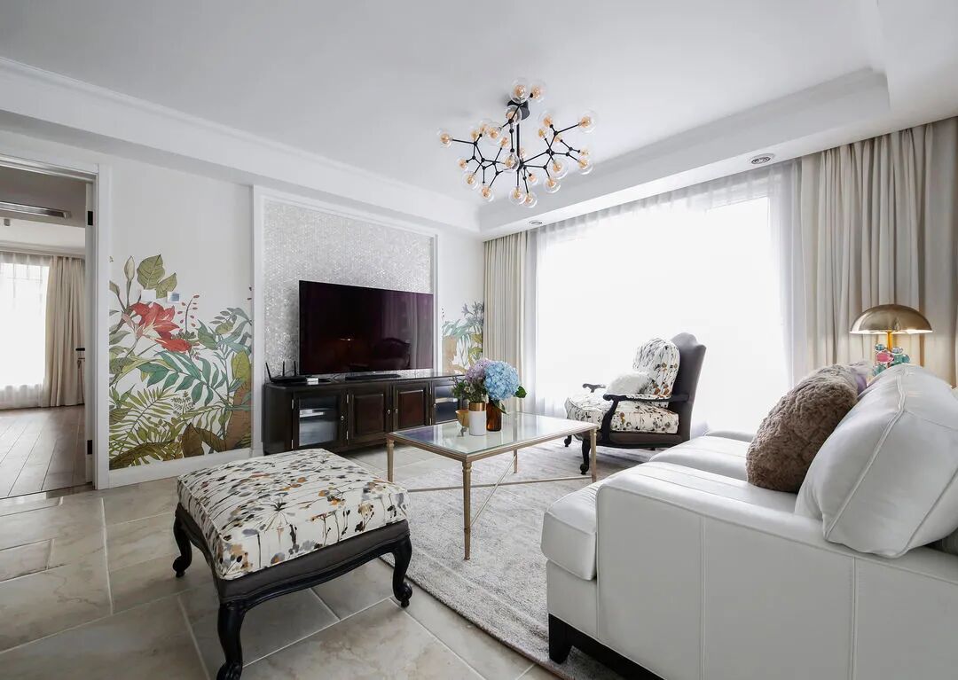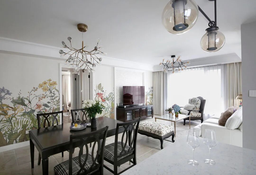 客厅餐厅共用的大背景墙,采用了一组手绘植物壁纸,给空间注入生机感。
