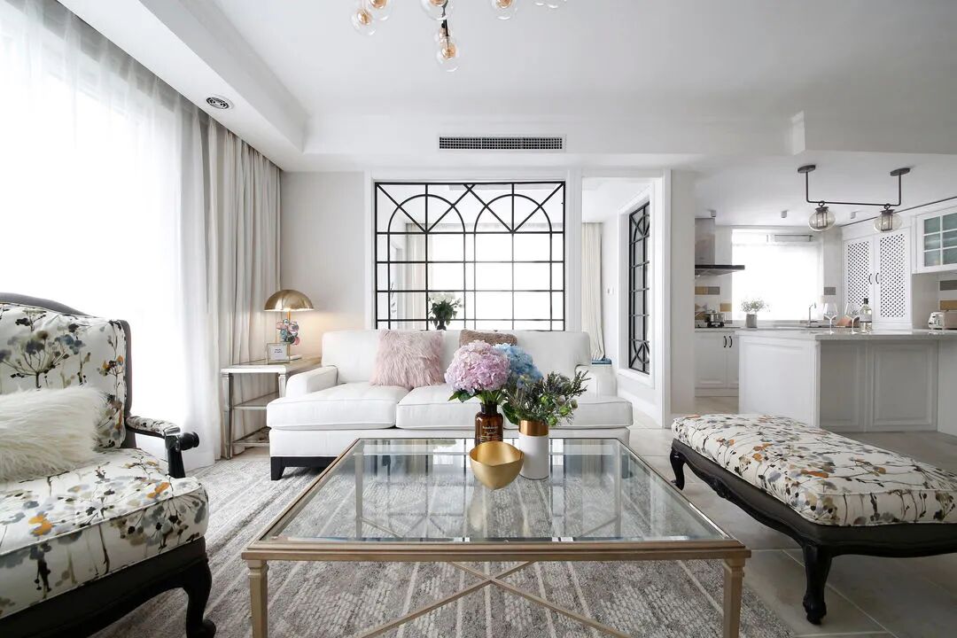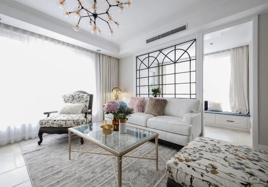 厨房、客厅、阳台之间有一根结构柱和一段承重墙,阳台无法全部打开,所以借势打造两个镂空铁艺花窗隔断,沙发有了背景墙,阳台空间独立了,采光也没有受到影响,花窗还成为了客厅的一个装饰点。