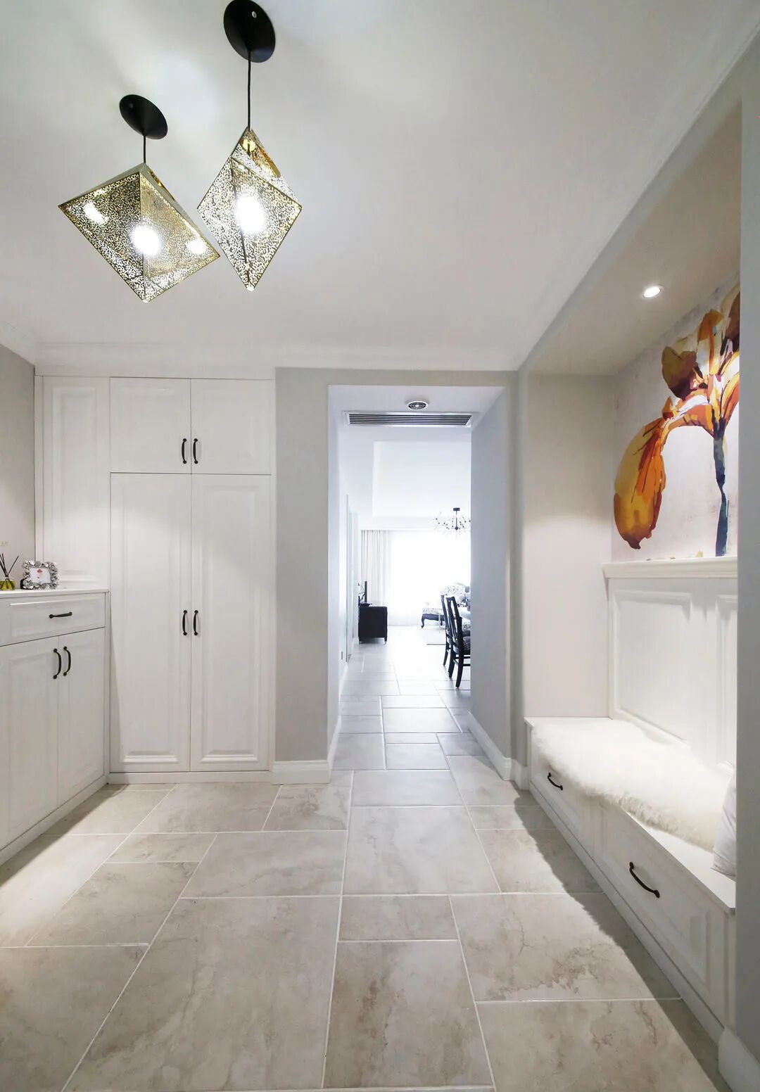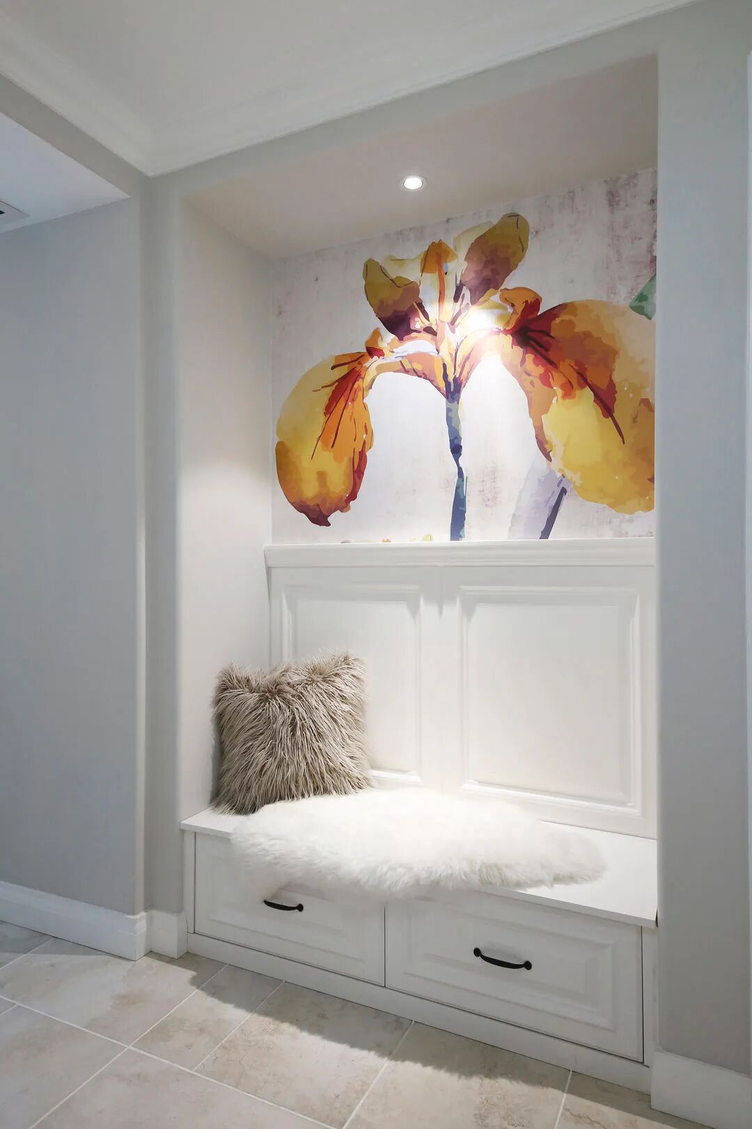 宽敞舒适的换鞋座,下面的抽屉还可以放包,一幅花卉壁纸,鲜艳的颜色提亮空间的视觉。