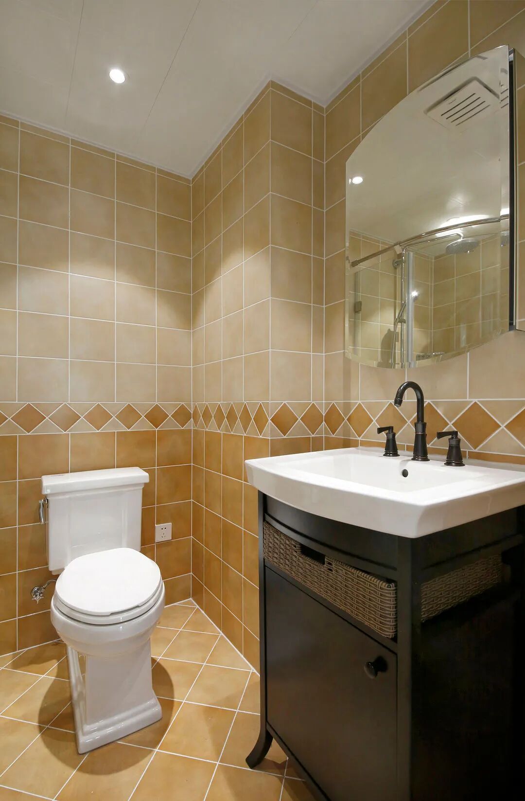 客卫是主要给老人房配套,选用了老人喜欢的暖色调。在照片左侧看不到的区域其实还有独立淋浴间和洗衣机烘干机,小空间大功能。