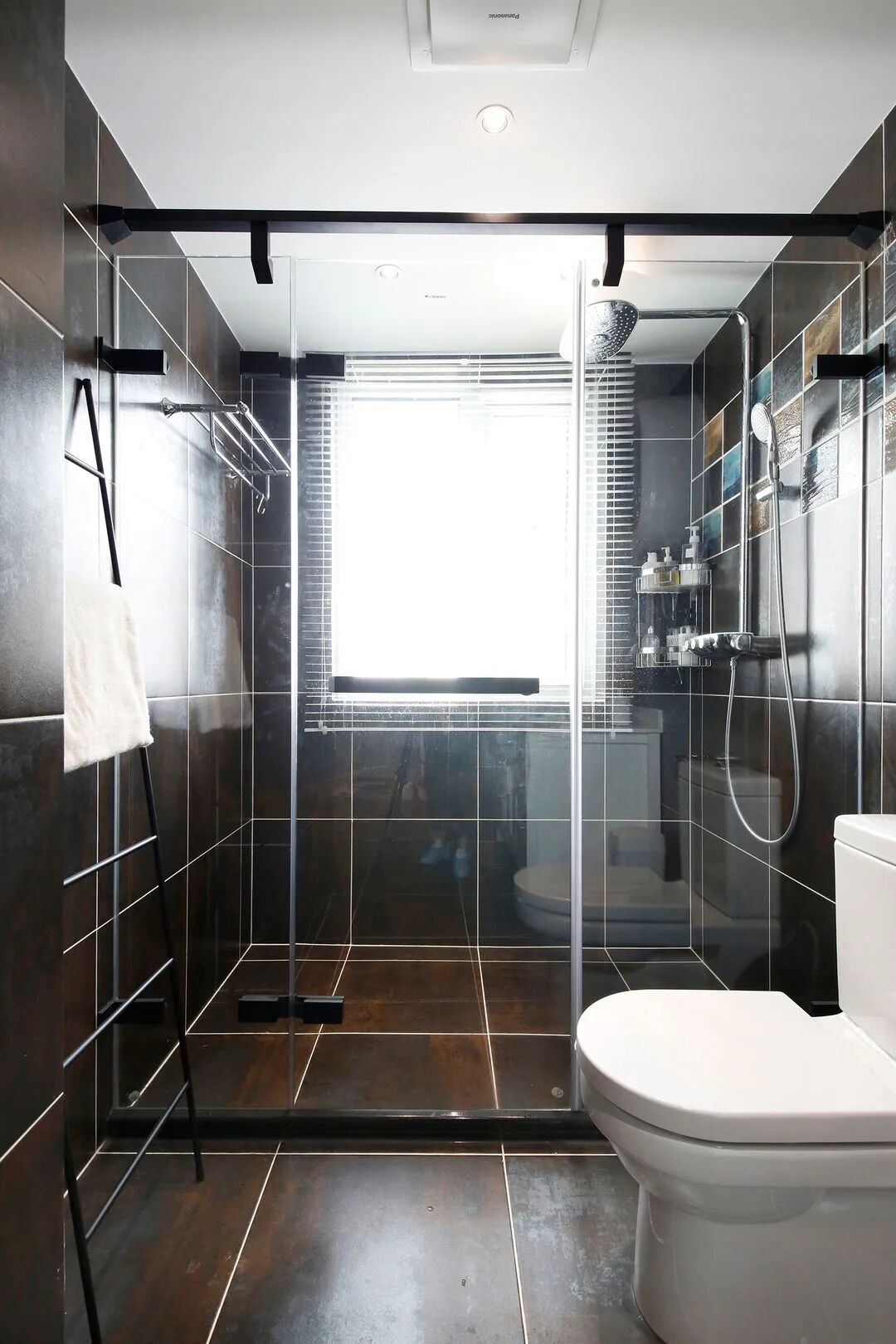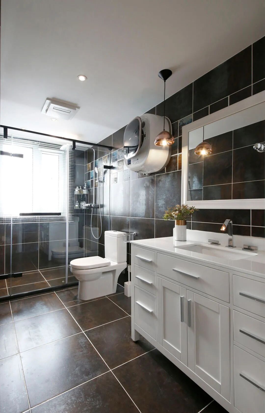 主卫有一扇大窗,光线充足,这时就可以大胆得使用深色瓷砖,搭配少量亮色花片,高级感和时尚感并存。