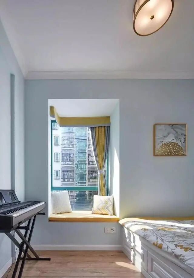 次卧的床选择了做成榻榻米的款式,给次卧带来更为的储物空间。在飘窗的边上摆放一架钢琴,也方便孩子平时在家练琴。