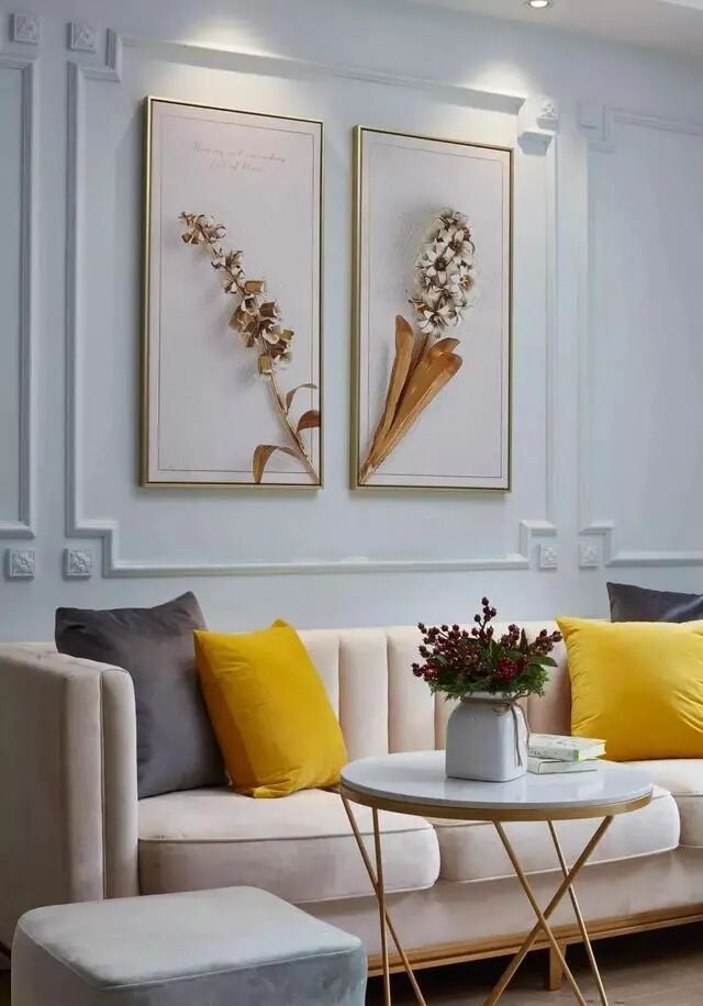 很喜欢这款客厅的沙发,给人一种慵懒、唯美的感觉。沙发背景墙上简单的做上石膏线装饰和挂画,青蓝色的背景墙显得更为清新。