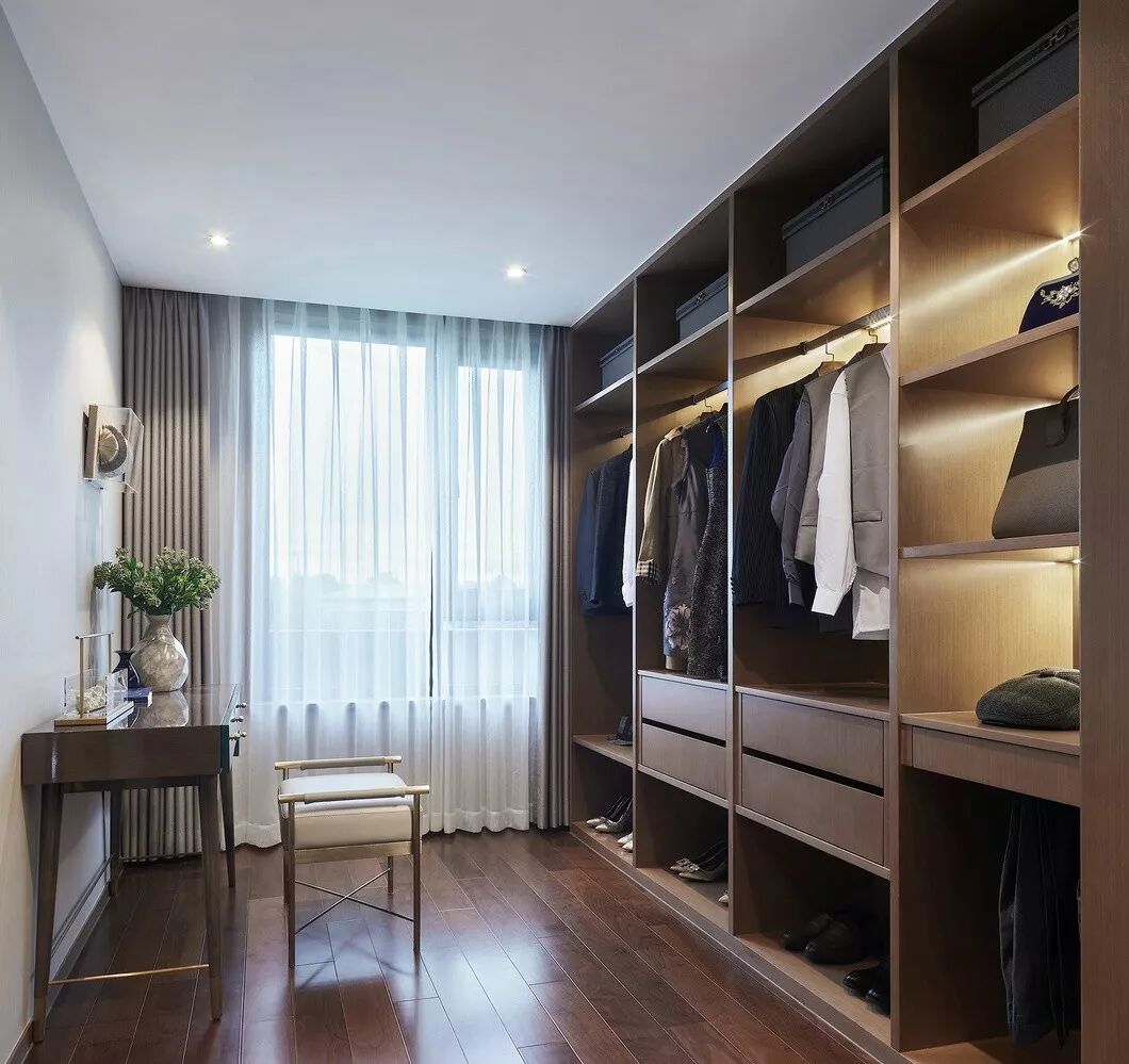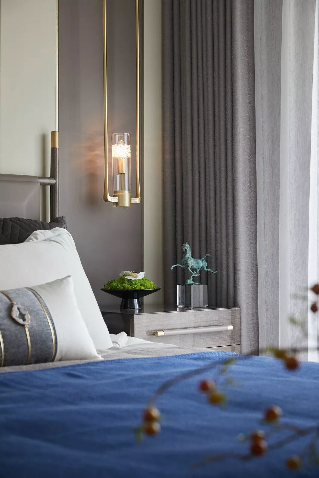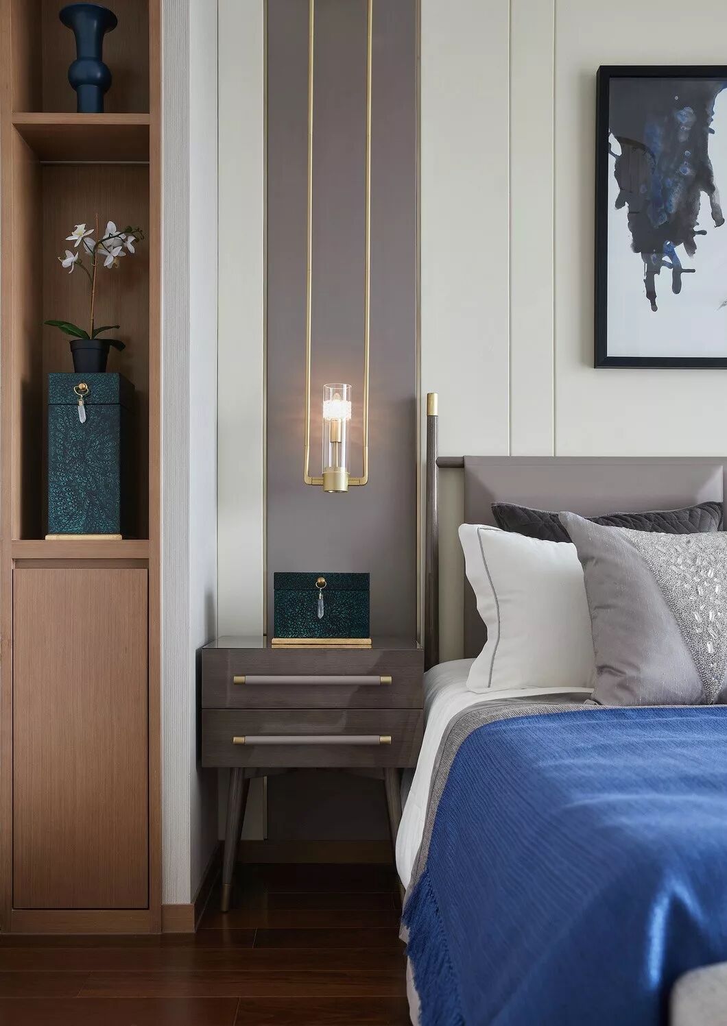 主卧套房独占一层,宽敞的卧室与卫浴间、步入式的衣帽间以及梳妆区,打造主人房礼序与尊贵并具的生活仪式。湖蓝与水墨灰糅合、木制与大理石搭配、棉麻与丝绸互映……空间所用的材质均显露着典雅的质感,现代简约形制与东方意蕴无缝融合,营造沉稳高雅的居室氛围。