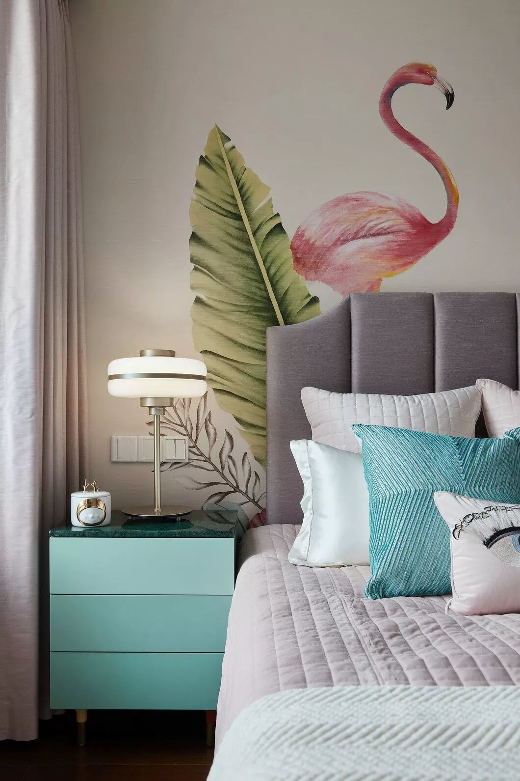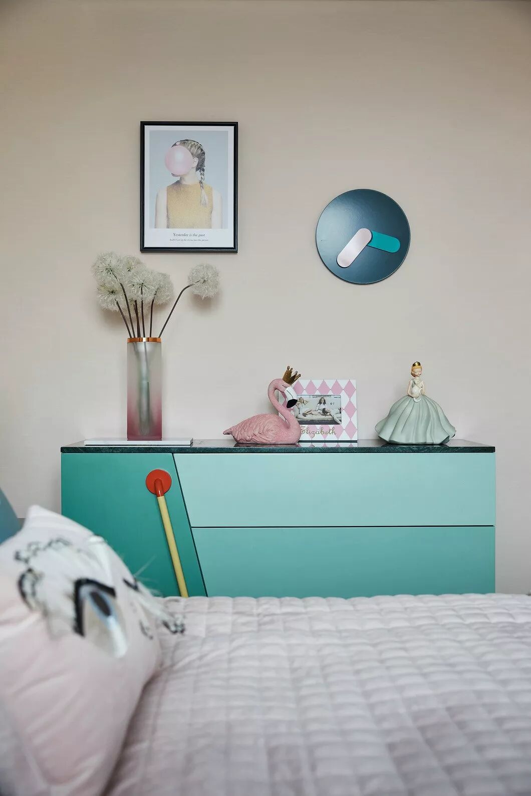 女孩房设计以马卡龙粉与水蓝色交织,火焰鸟、天鹅、公主玩偶以及羽毛装点的趣致抱枕,这些细处的陈设无一不在装点着空间的灵动柔雅,展演出温雅安宁的情调。