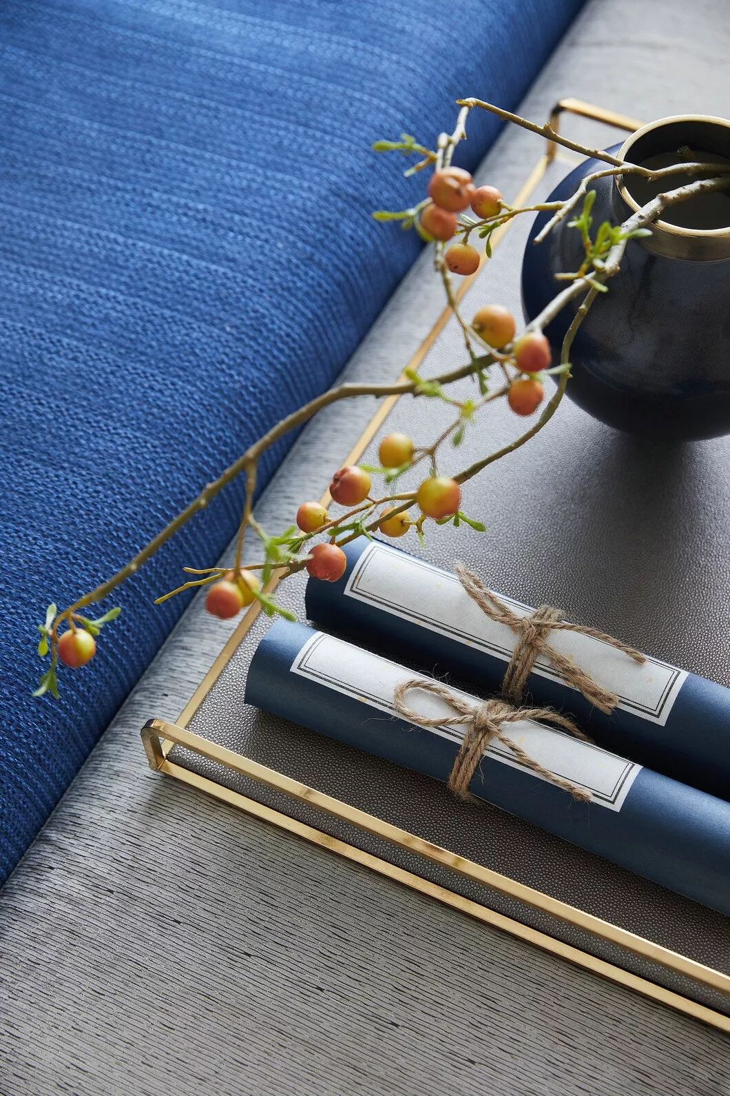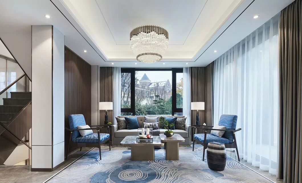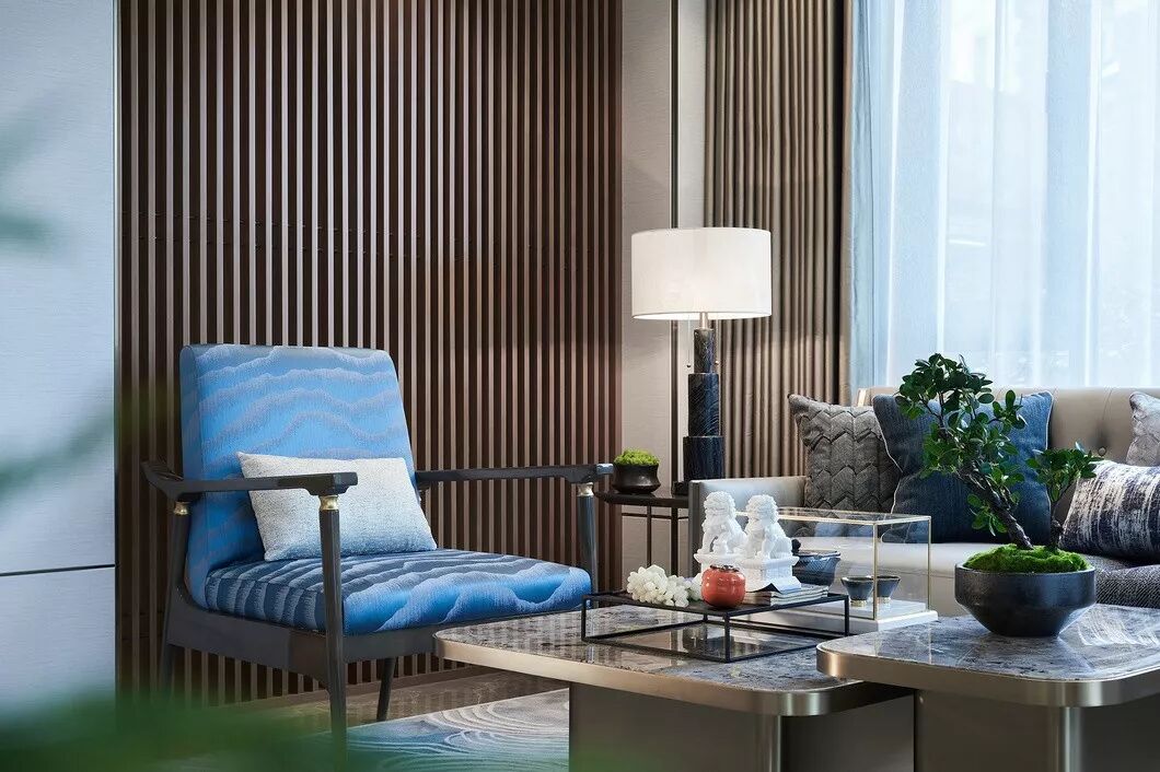 院墅内的设计,处处透露着对东方清雅生活意境的美好追求。室内的主色调汲取了江南水乡的湖蓝色,清雅的色调与现代简约形制融构于一体,在空间中铺陈出别有风致的现代中式美学意涵。