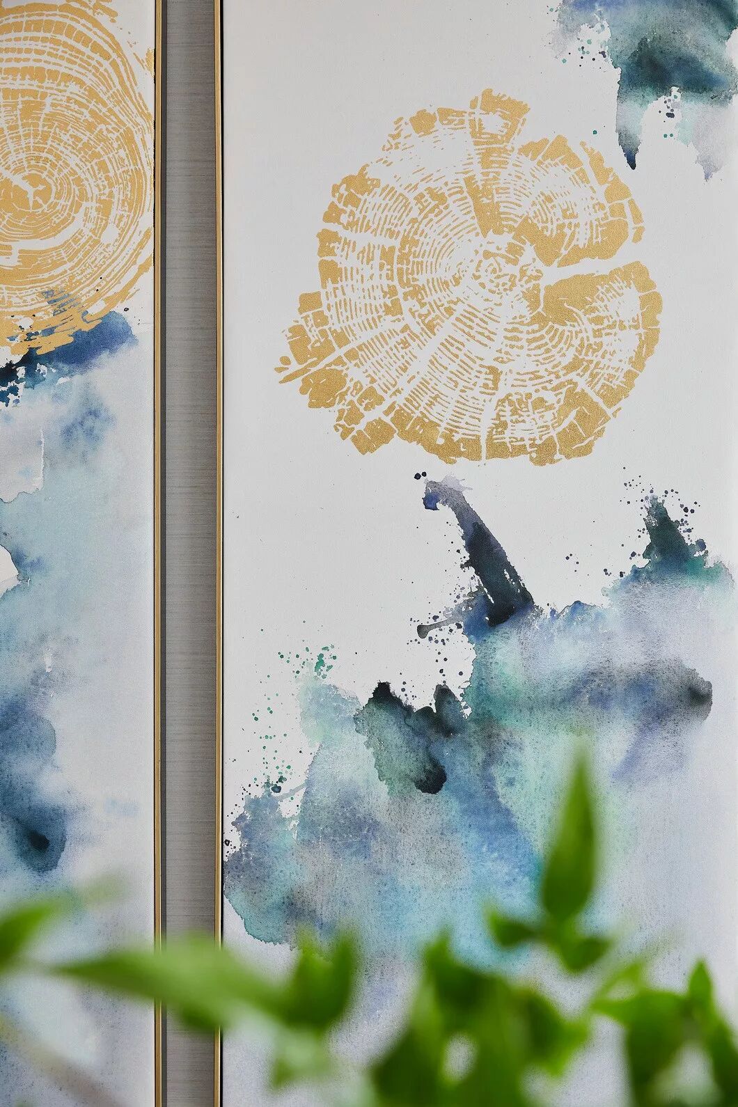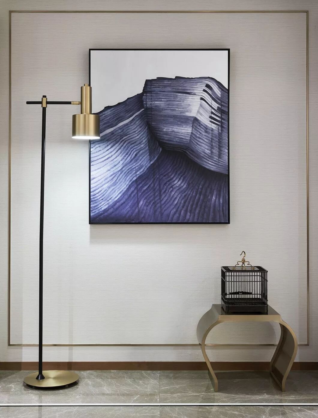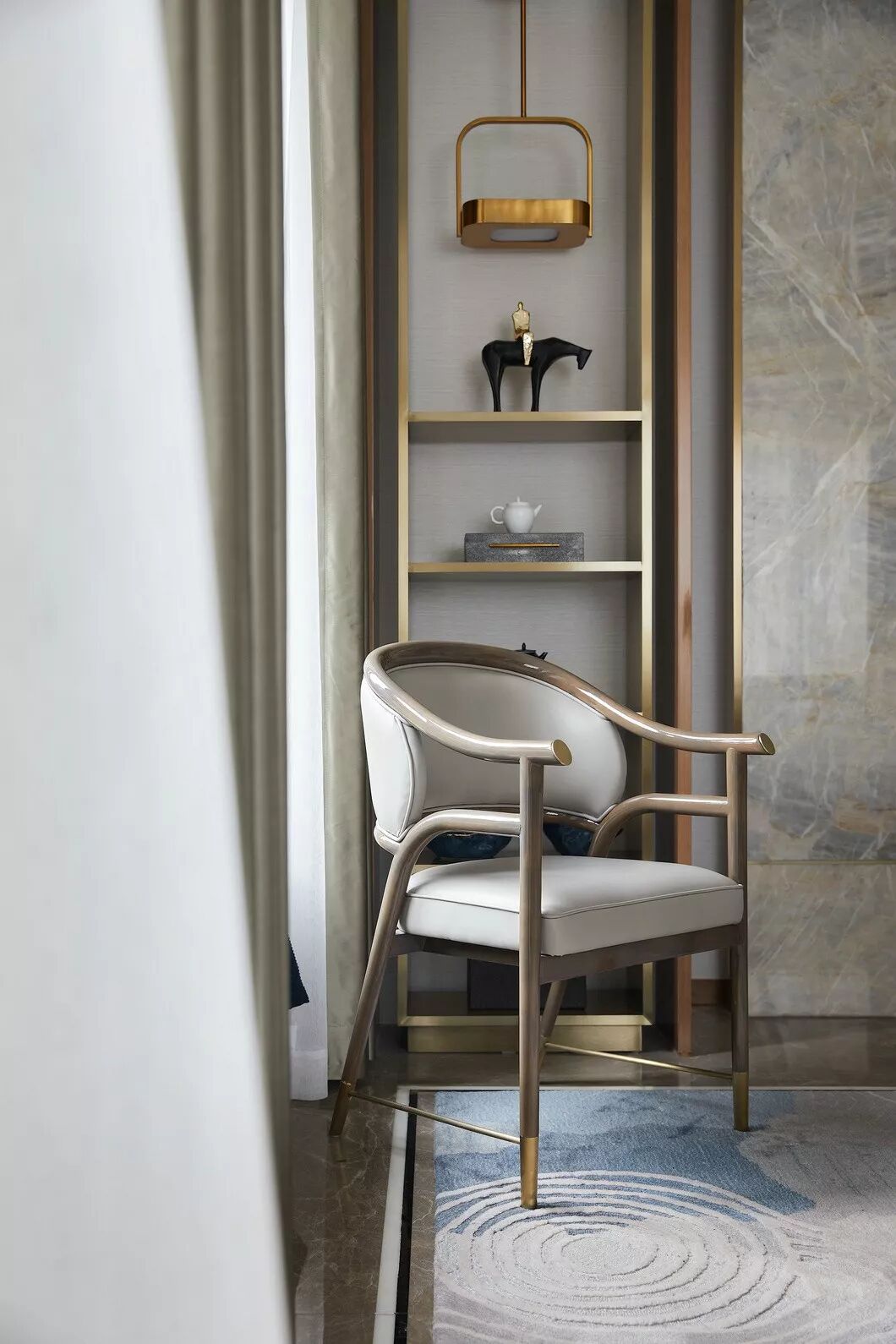 走入空间,可见水纹的柔美点染于软包、画饰、地毯等软装上,渲染出怡人舒适的空间氛围。三扇大面积玻璃门窗,将四时风光纳入框景中,邀人坐看自然的生机、时间的足痕。