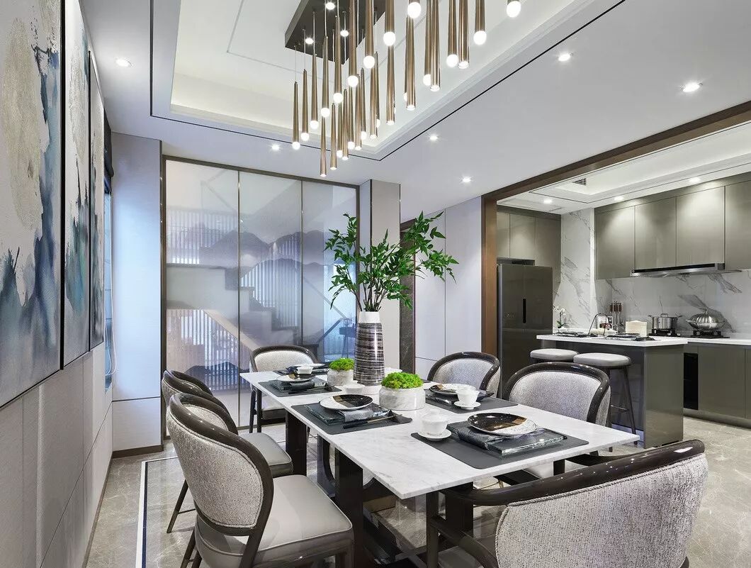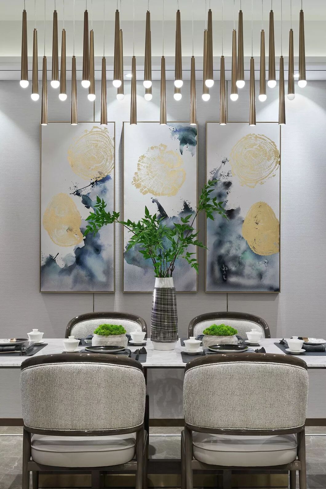 餐厅采用对称式的布局构设,用烟灰色的淡雅铺陈空间。一幅描绘着缥缈烟岚的水墨画,将中式风格的特征注入,与大理石、软包、棉麻等现代材质加以融合,打造出更贴切当下审美风格的就餐空间,格调更显高雅端妍。