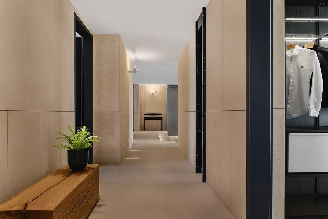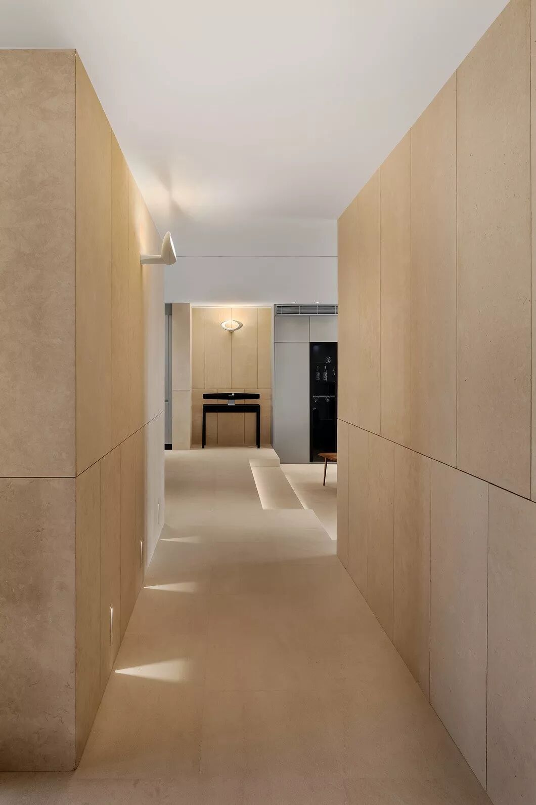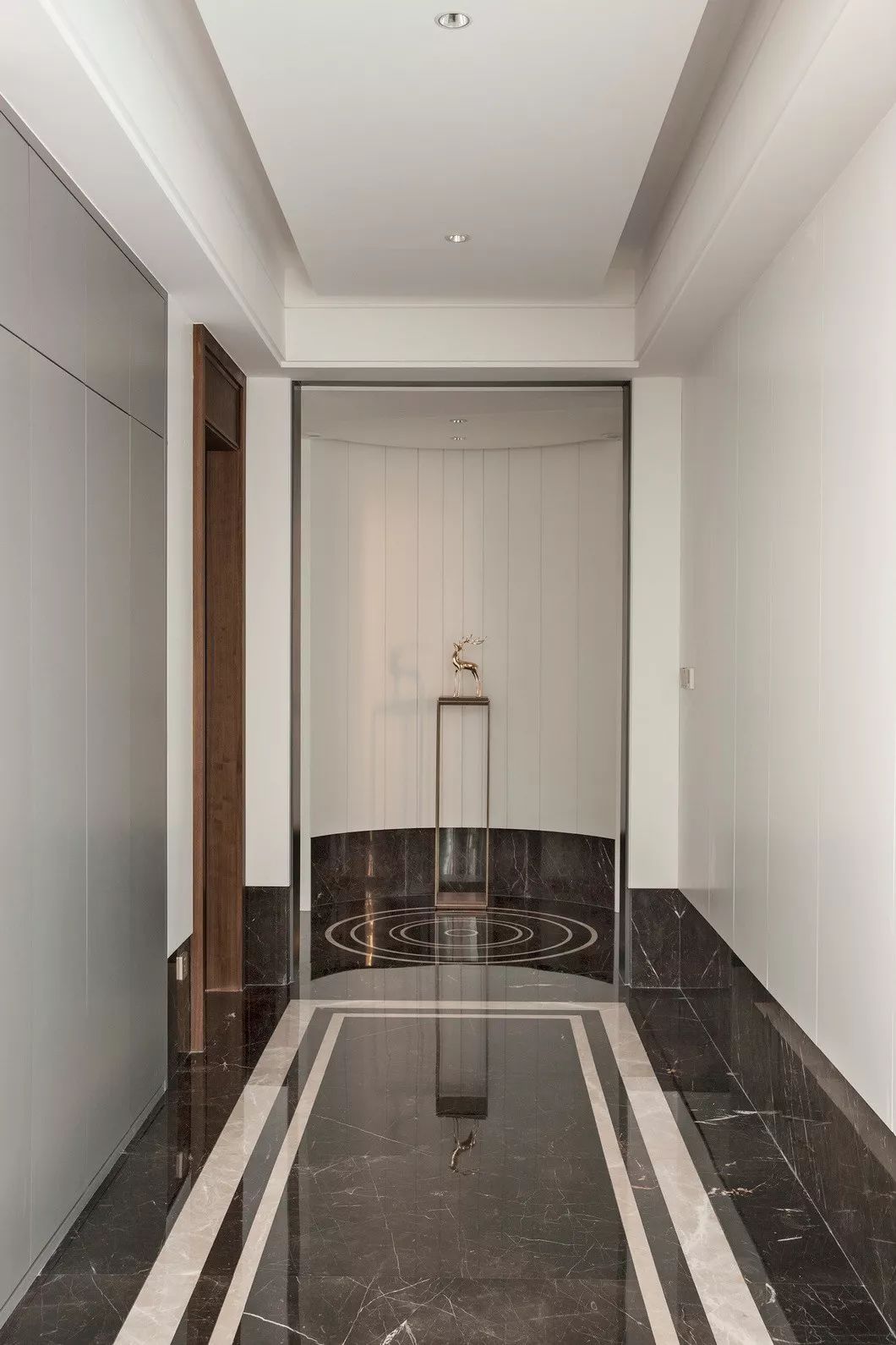 同样的设计格调还体现在过道之中,利用几何透视原理加强进深感,形成强烈的视觉张力与质感碰撞。