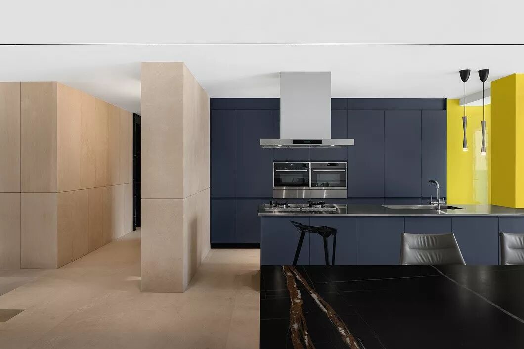 厨房里定制了大量的深色储物柜,巧妙地将电器、餐具和杂物统统隐藏起来。具有隔断作用的操作台面,还兼顾了收纳需求及空间弹性,达到美感与机能的平衡。
