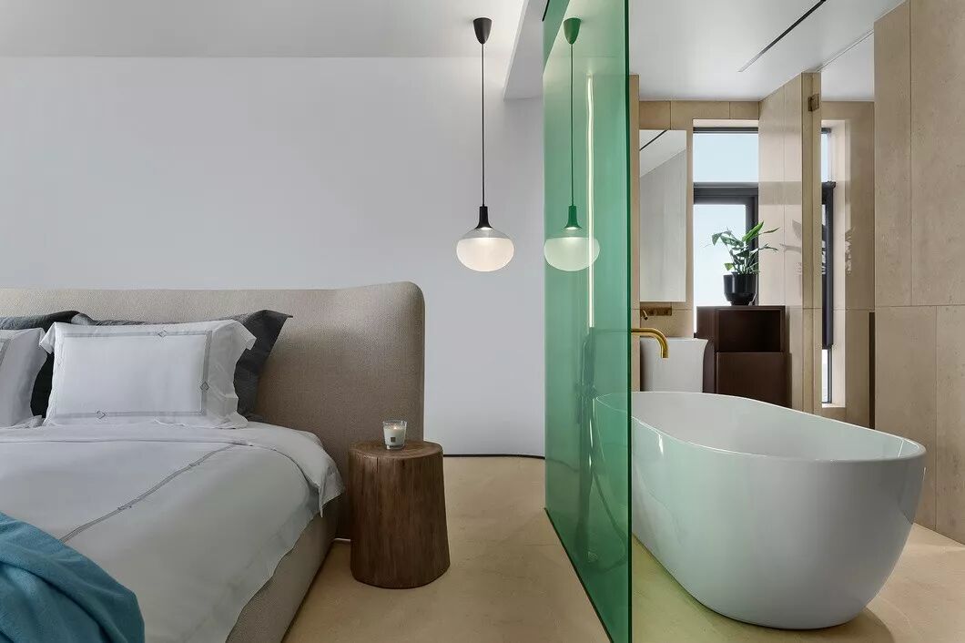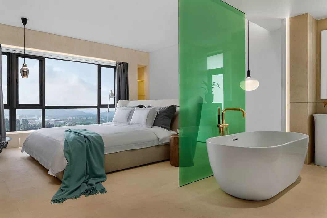 主卧里面内置白色浴缸,以一面绿色玻璃相隔,为空间增添更多的色彩与表情。