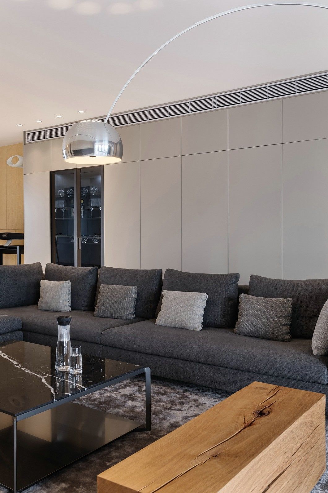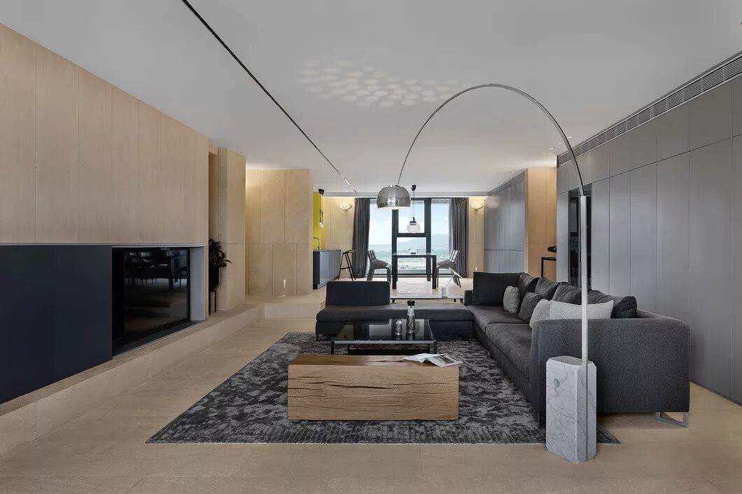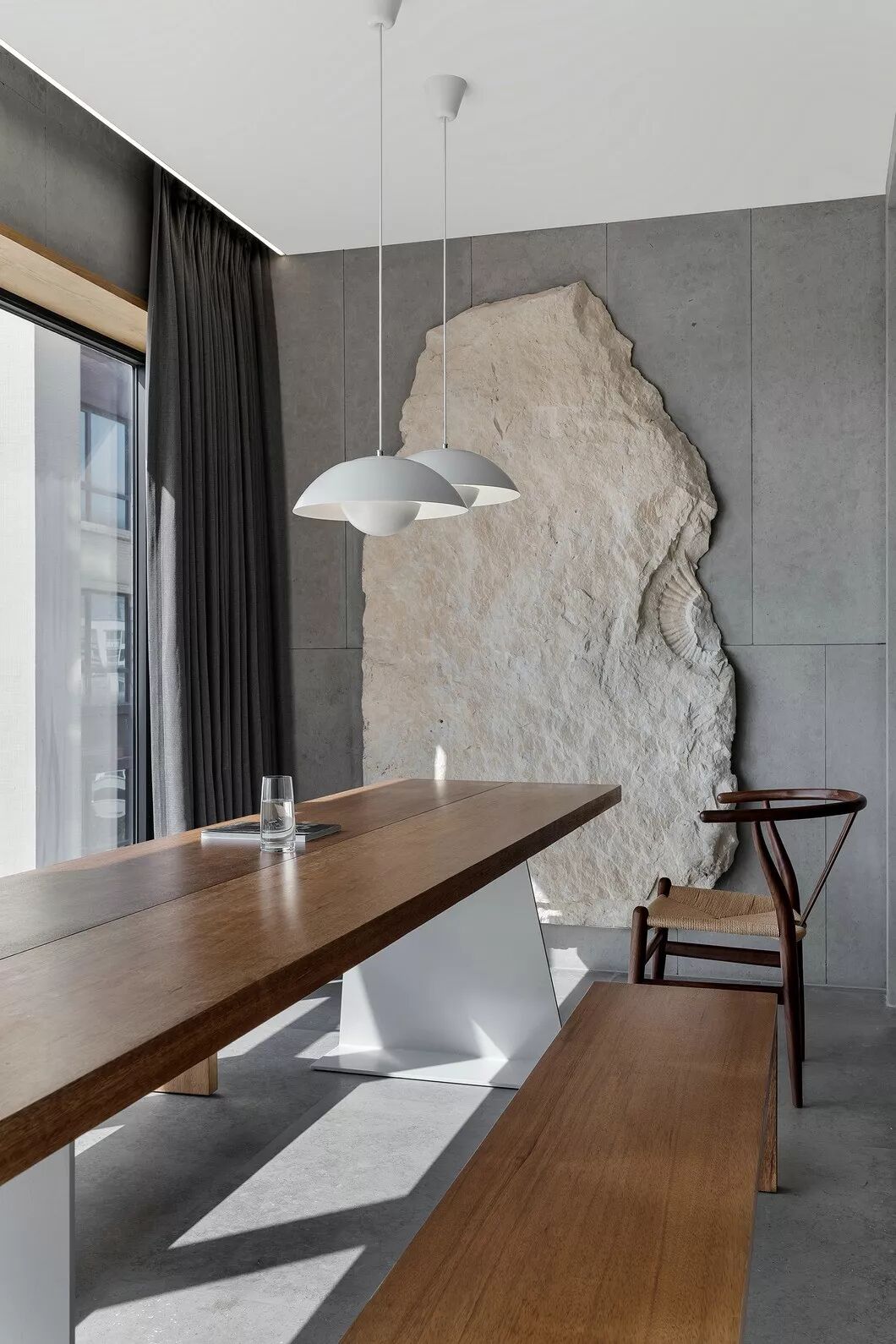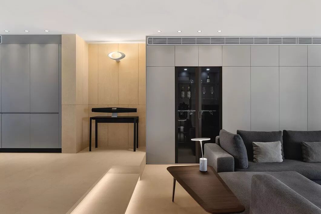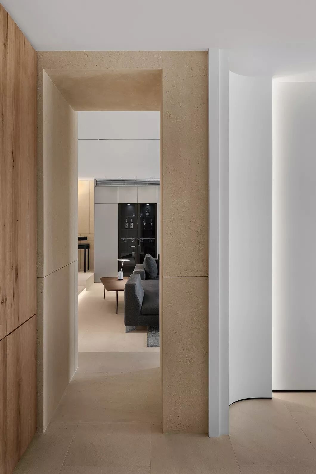 墙地面均采用温润质朴的原木材质,与略显冰冷的灰色调进行中和。从法国进口的削光大理石,也将其质感与肌理尽情展露,为空间注入了一股高雅的格调。