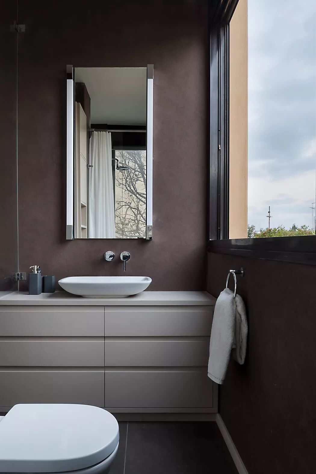 在卧室里,一扇长条形的窗户环绕着整个空间,这使我们无法建造隔断墙,这是一个挑战:处理没有墙壁的浴室。我们的基本假设是,如果两个房间有如此之大的连续性,我们应该尝试挑战我们习惯的瓷砖墙和内敛的淋浴和厕所的范例。