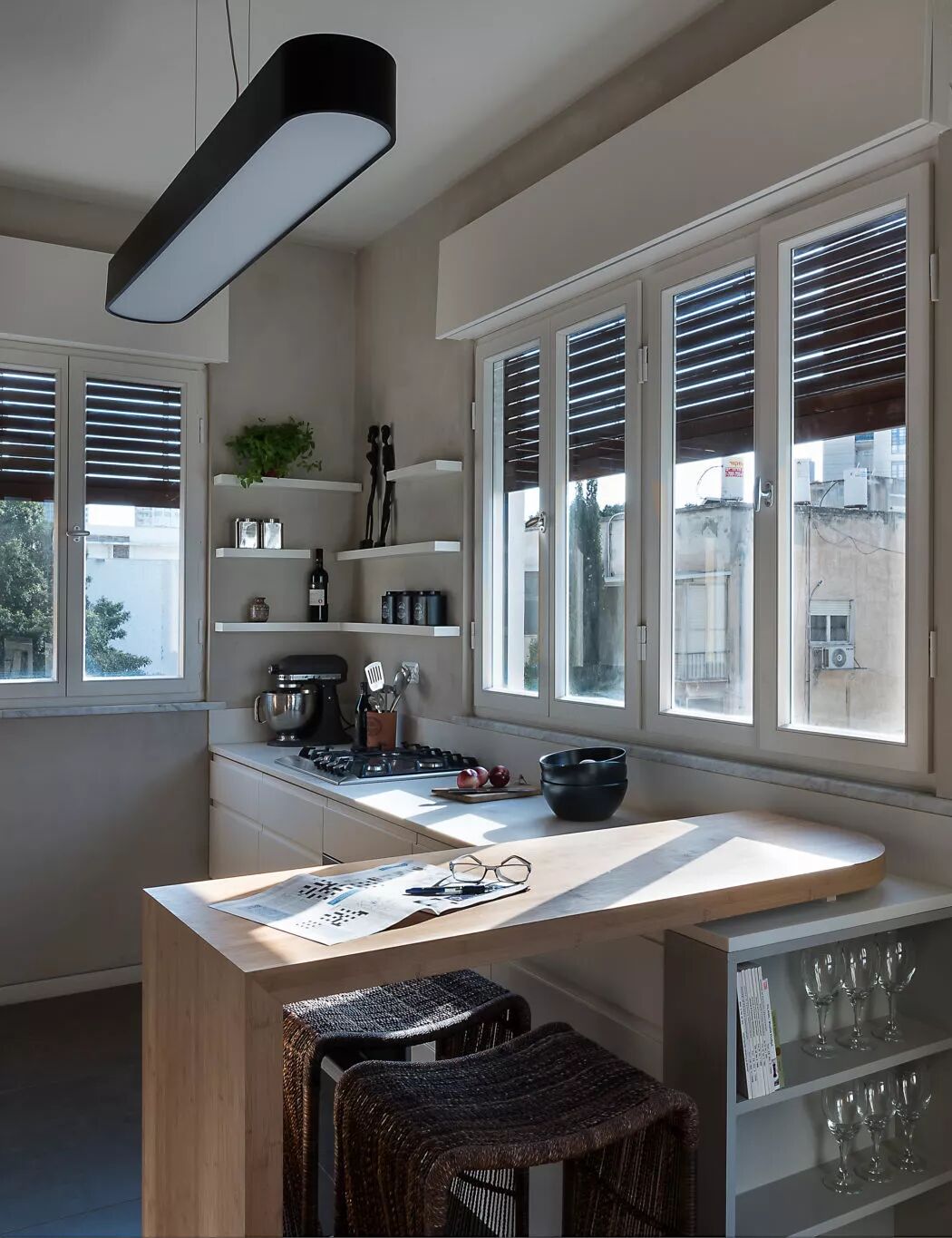从厨房的一侧,箱子包含工作区,冰箱和高食品柜。根据要求从招待区离开的厨房的租客的要求,立方体的这一侧隐藏在公共空间内。在方块的厨房部分前,设计了一个餐桌/柜台。它可以通过在轴上移动面部来面对膳食或附加的工作表面。