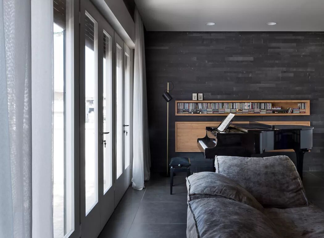 这间公寓主人是一位天才的钢琴家,他喜欢在家中招待朋友和举办音乐之夜。面临的挑战是创造一个灵活的空间,适合娱乐,适合各种招待情景和协作音乐活动。