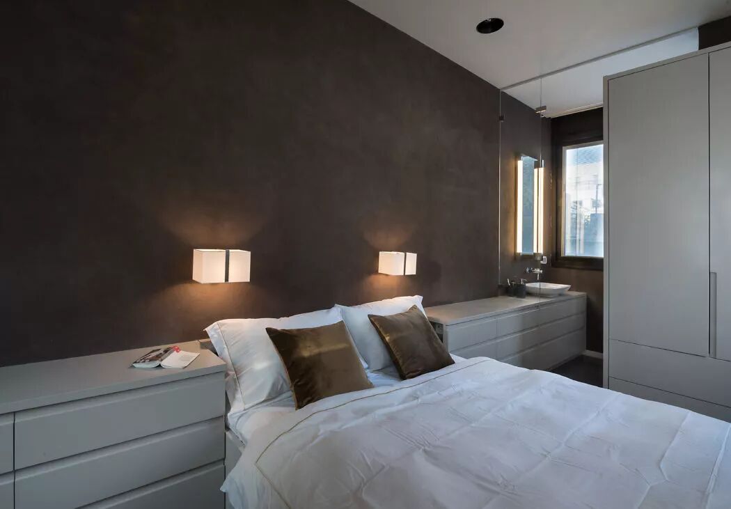 卧室柜为卫生间的私密部分创造了一个密封的隔断,四周都是玻璃。因此,有一种感觉,内阁站在一个连续的空间四面八方,但卫生间的亲密关系仍然存在。