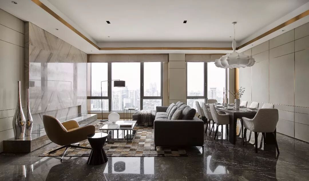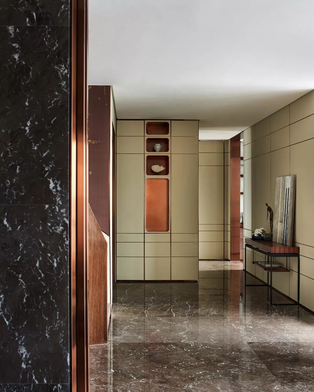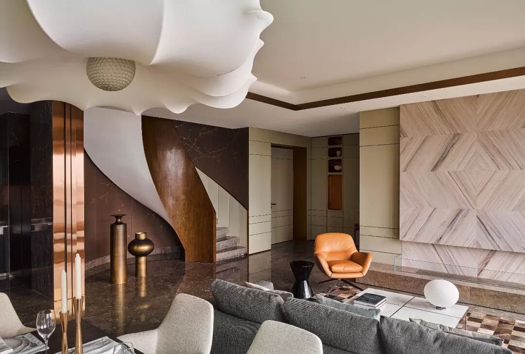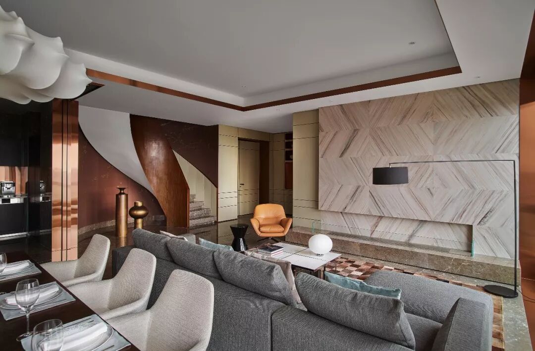 凭借对高端豪宅的深刻洞察以及驾轻就熟的操刀经验,设计师以抽象现代的视觉符号探索原法租界的别样生机,“通过对地理位置的考察,将建筑与环境的共生特性融入到材质的变化中,寻求一种对撞与平衡之法,尽展繁华都市风貌。”设计师如此概述其设计宗旨。