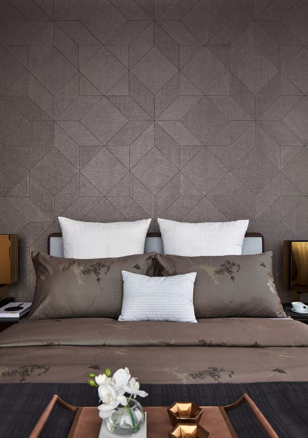 主卧采用块面混搭来塑造空间,壁布硬包经由U型内凹金属条的分割,一半浓烈、一半素雅,各具风情。半包围型床背由皮革嵌入木质,有效平衡立面视觉。