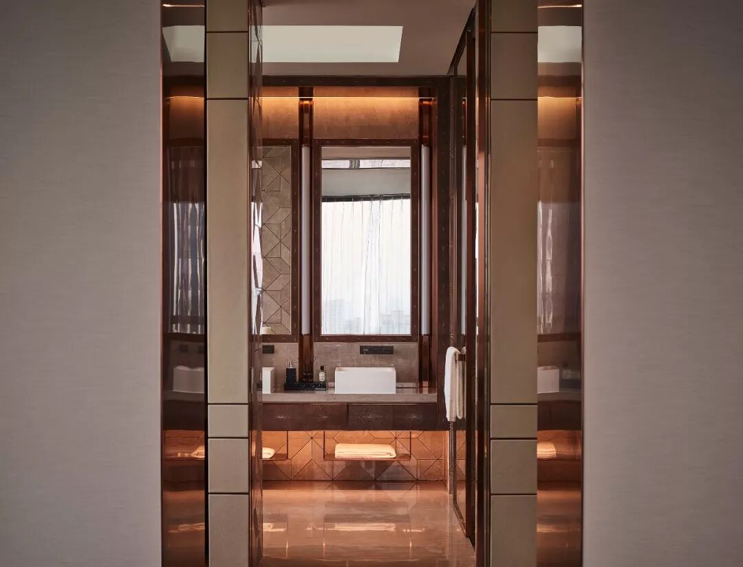 主卫墙面大面积以几何拼花彰显出序列结构之美,在灯光效果的渲染下,可谓色泽交错,塑造出三维立体的视觉张力。顶端设一天窗引入光线,更是活跃了空间意境。