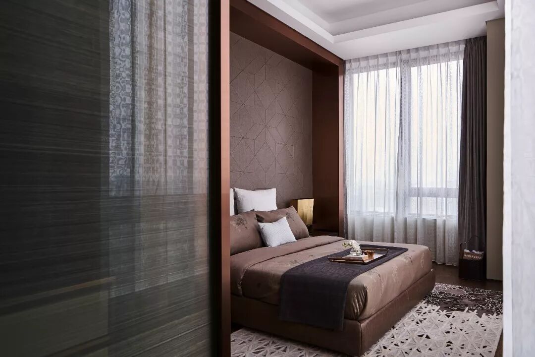 长辈房套间色调沉稳内敛,与主卧套间一脉相承的拼花背景墙被纳入其中,规整中又极具韵律变化。庄重华贵的深咖色床品静淌,调适出一种雅致心境。