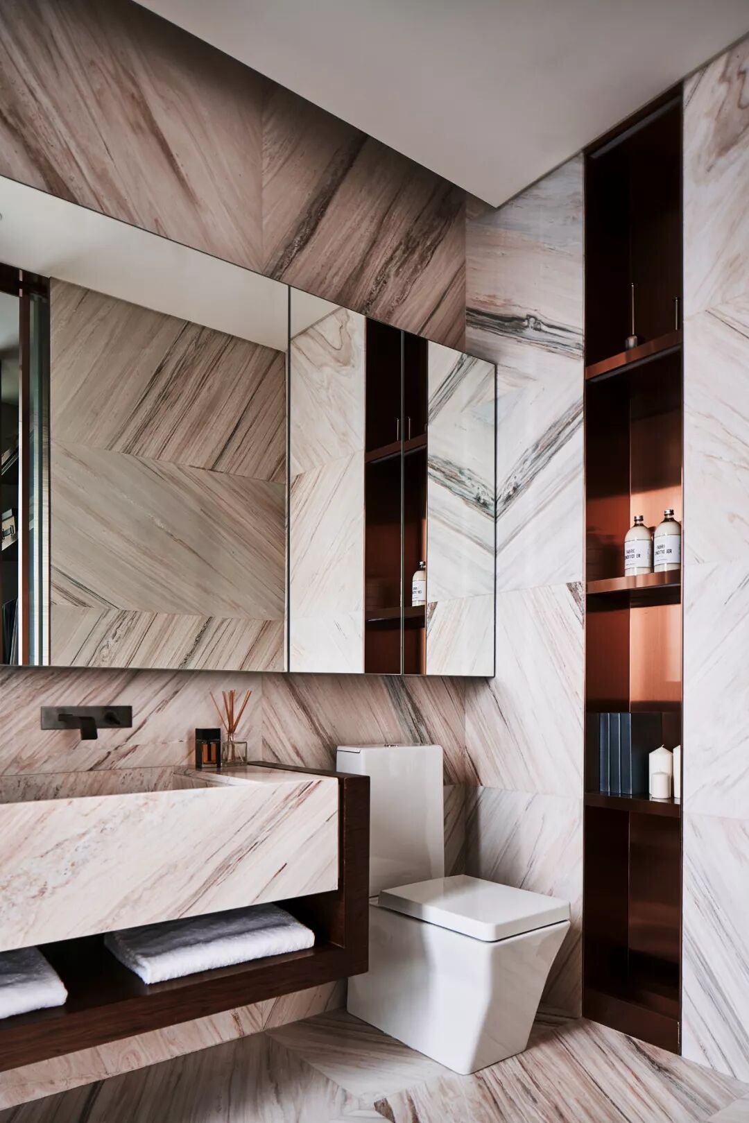 卫生间延续客厅背景墙风格,对纹大理石一体而上,右侧面利用建筑原始墙体打造金属展示架,兼具功能与美感。木质呈悬浮U型包裹台盆,映射出刚与柔的交融。