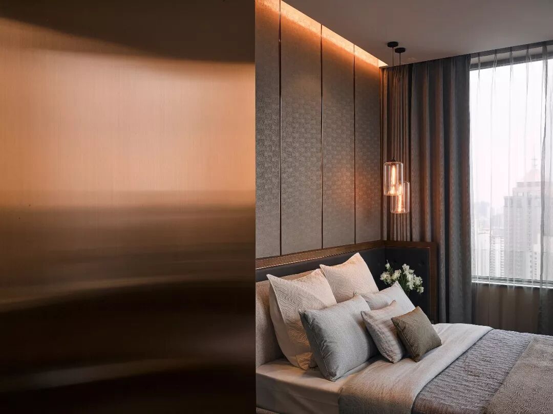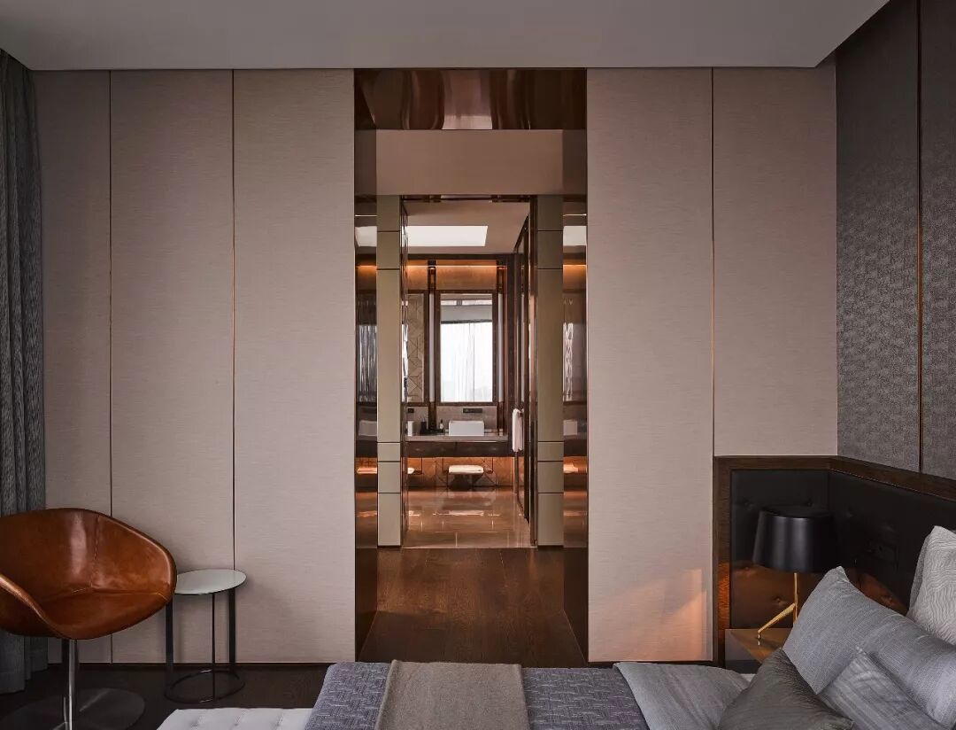 步入主卧套间,便可一览城市天际线,两侧开敞式衣帽间,以虚实错落的自由姿态,实现合理分格且各异其趣,对至高品位的追求正显露于此。