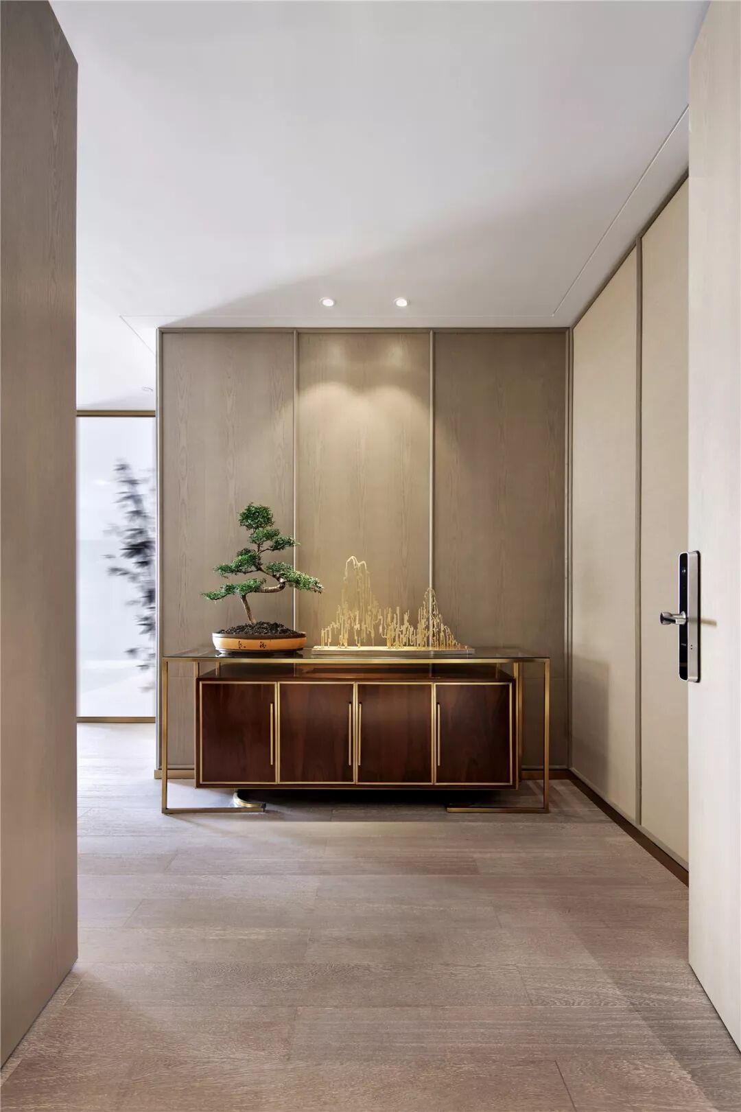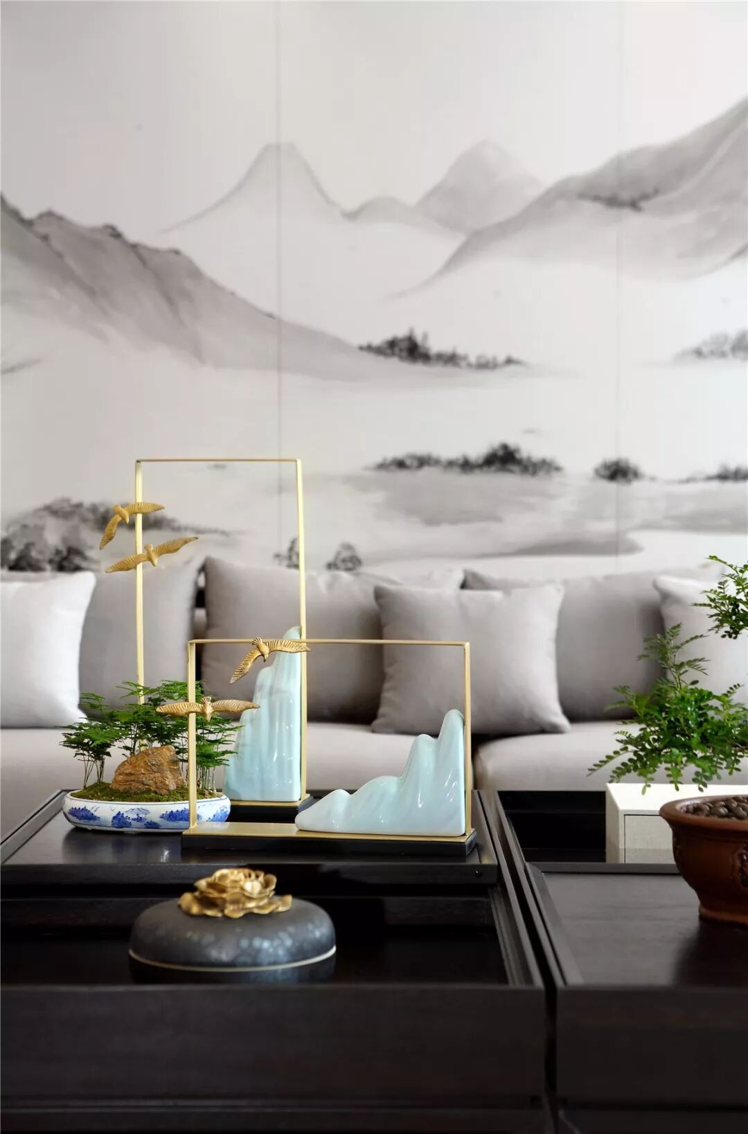 视线随着过道延伸,端景台处的绿植、盆景、写意山水画绘成的静谧画卷立刻映入眼帘。