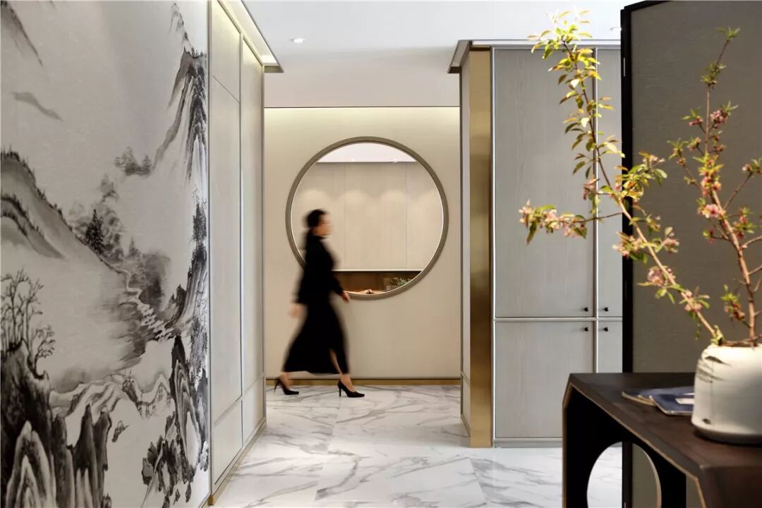 设计师将中国水墨画植入到当代设计语言之中,通过“山”、“水”“桃花”等元素,让置身其中的业主感受到世外桃源的情境体验。