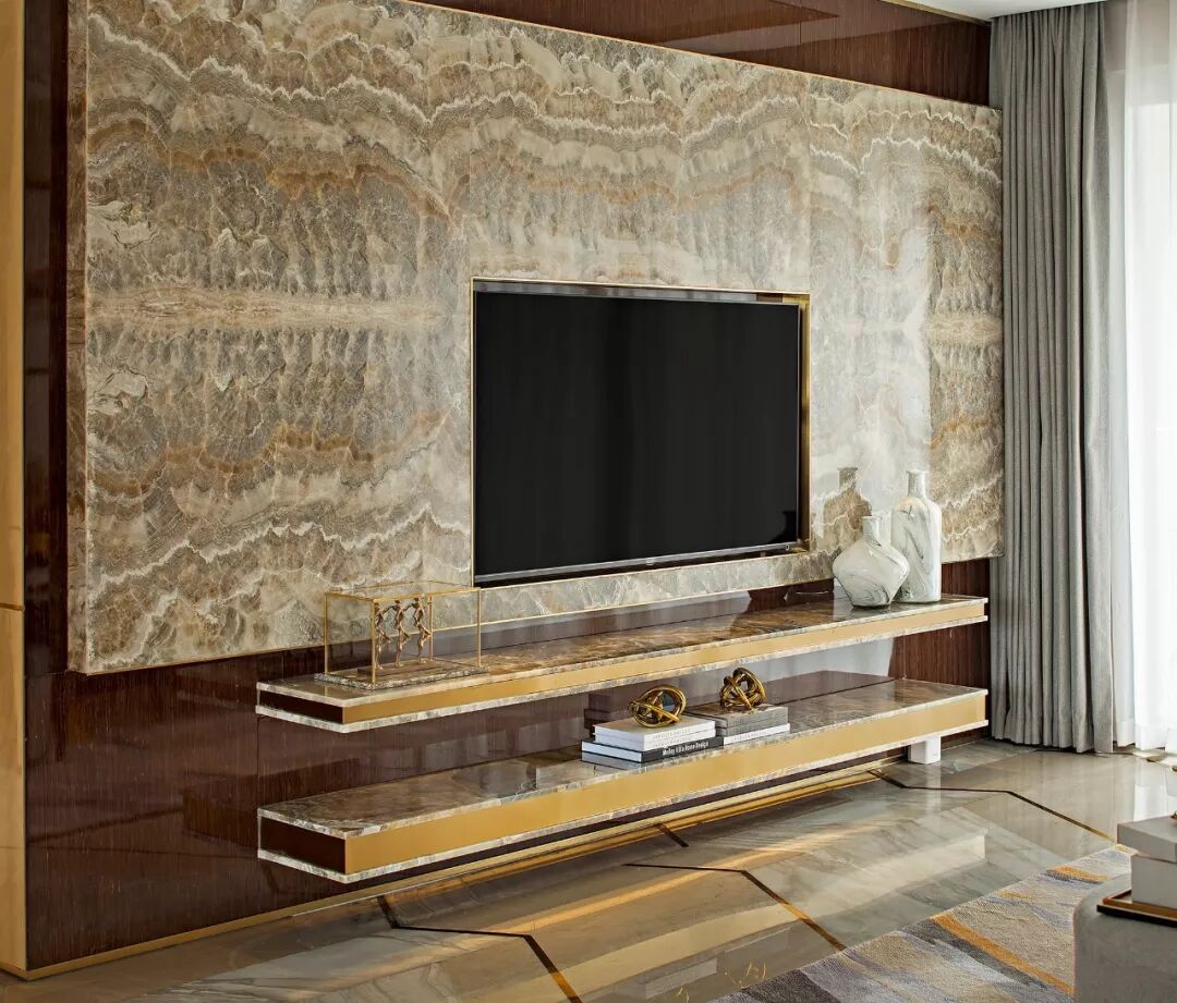 电视背景墙面显现着玉石的天然纹理,与隔空相对的抽象艺术挂画完美呼应。