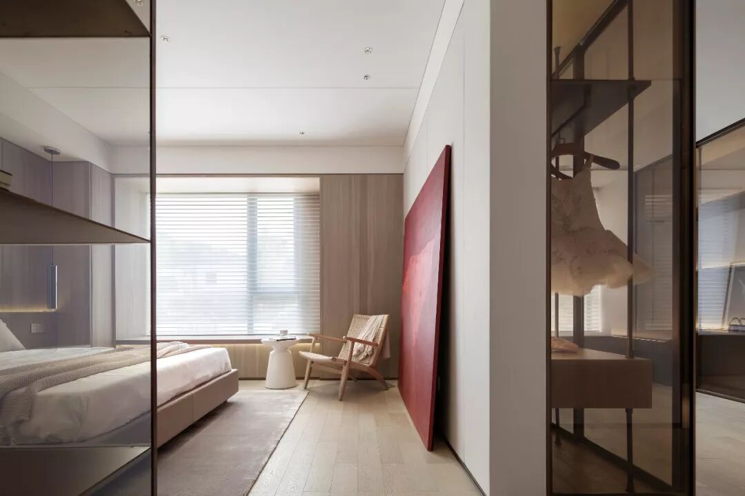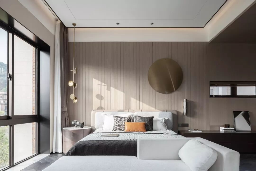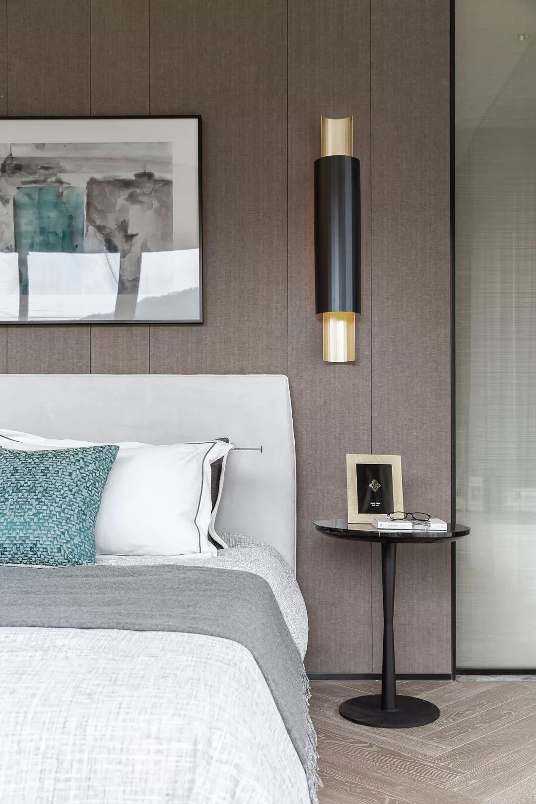 木制结构糅合在素净的空间内,床头以格栅式的木饰面作为背景装饰,配以轻暖光泽感的金属灯具,折射出宜人的温度。