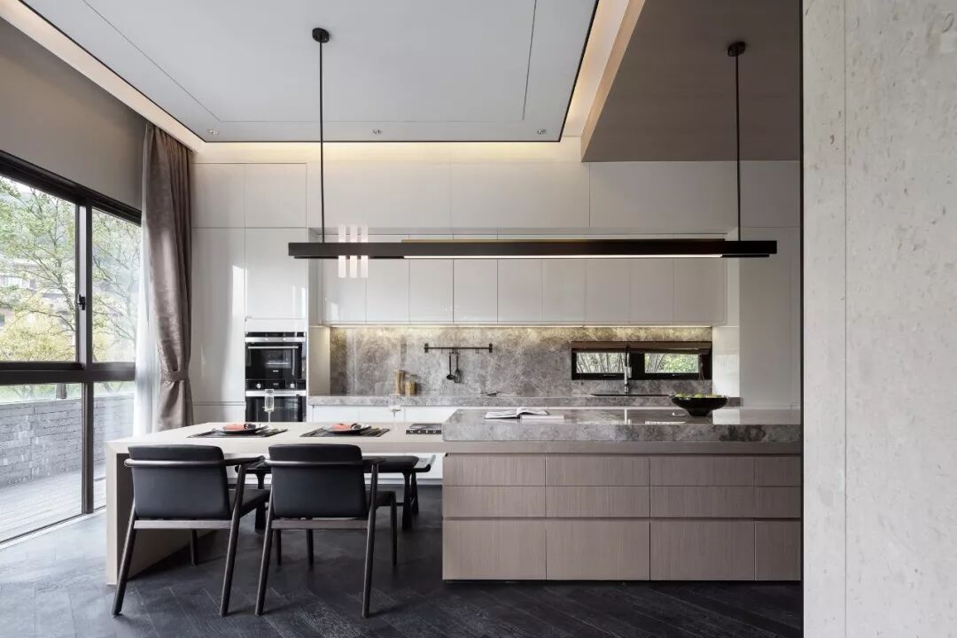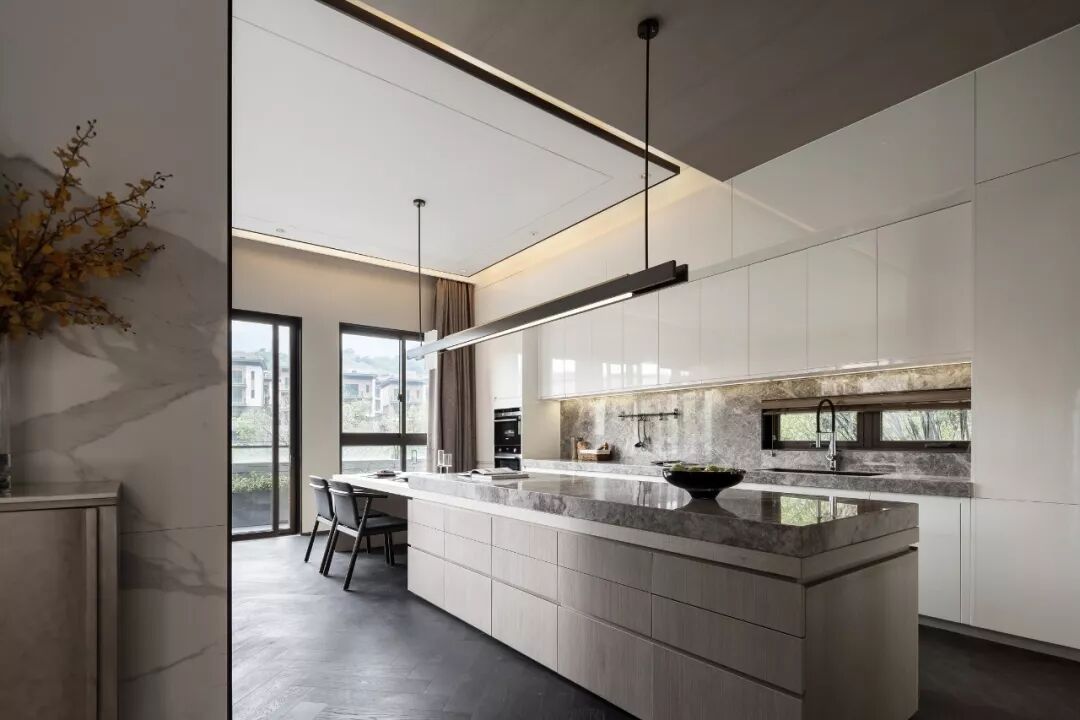 一层核心功能区由中西厨、餐厅、客厅组成,西厨中岛的设计在空间中与中厨相互补充 ,客餐厅与户外的观景平台相连接 ,为家庭聚餐和观景的核心空间。