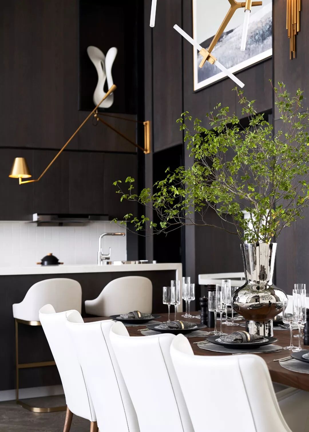 圆形餐桌与方正岛台,块面相对,既平衡比例,又塑造张力。