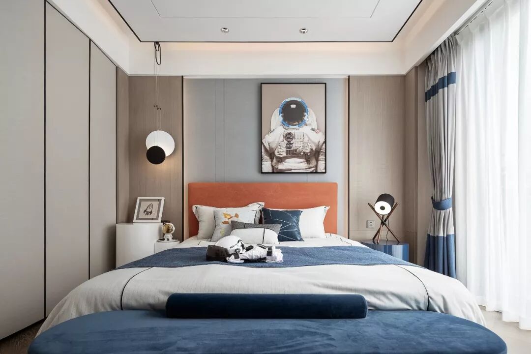 男孩房以航空主题为陈设亮点,卫生间硬装设计干净利落,沉稳的灰色大理石给予空间简洁轻奢的质感。