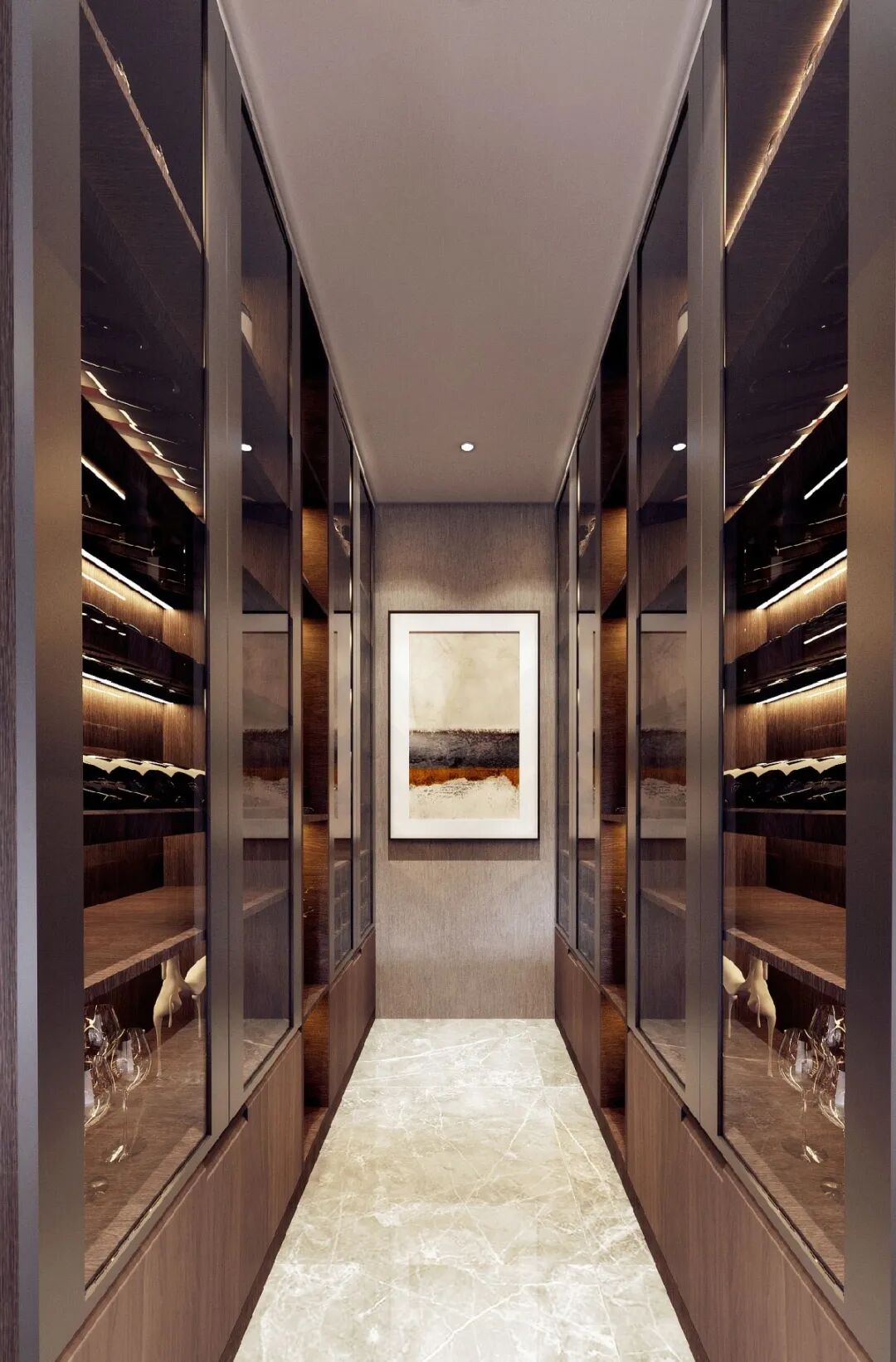 双一字酒柜布局,打造如酒窖般的储酒环境,满足不同酒类的储存。玻璃柜门增加空间通透感,集收藏与展示一体,尽显主人家居品味。