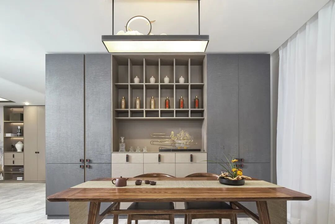 新中式风家居如何协调不同种类酒的藏与露?采用半开放架+封闭式结合,外露的开放架仿窗格设计,将高低尺寸差异化,返璞归真,更添古韵。