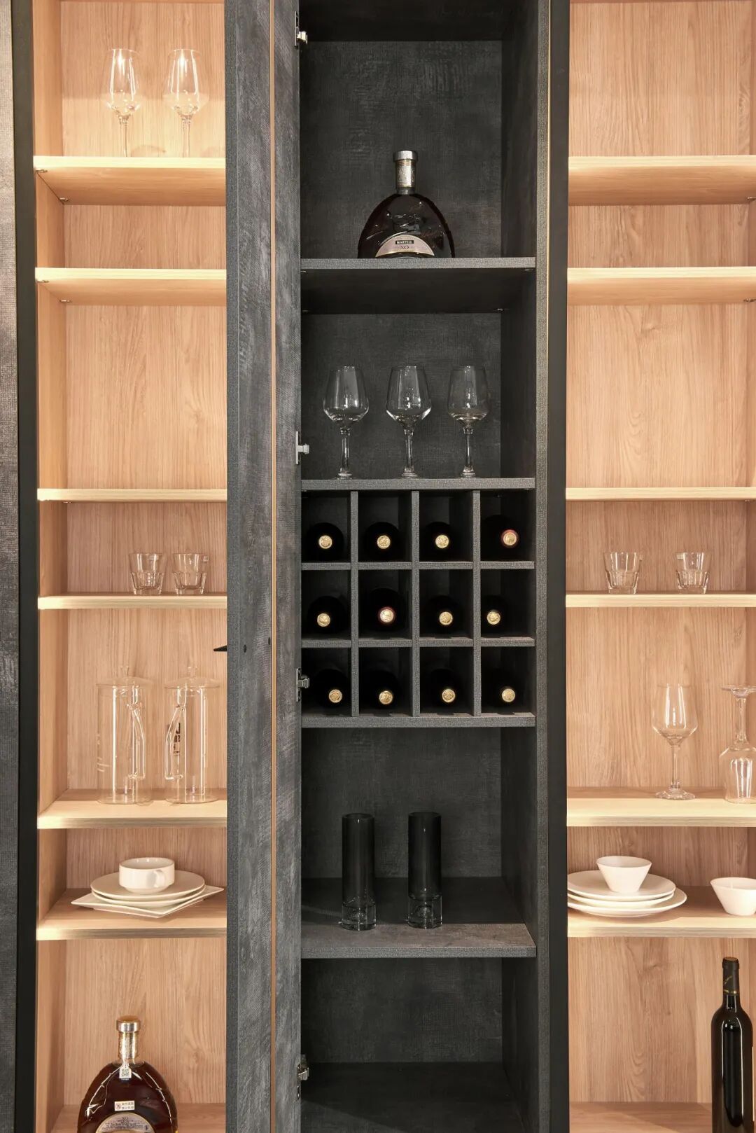 开门柜内置红酒架,不同高度的三层层板+红酒收纳格,满足各种酒类的收纳需求,生活品味在此沉淀。