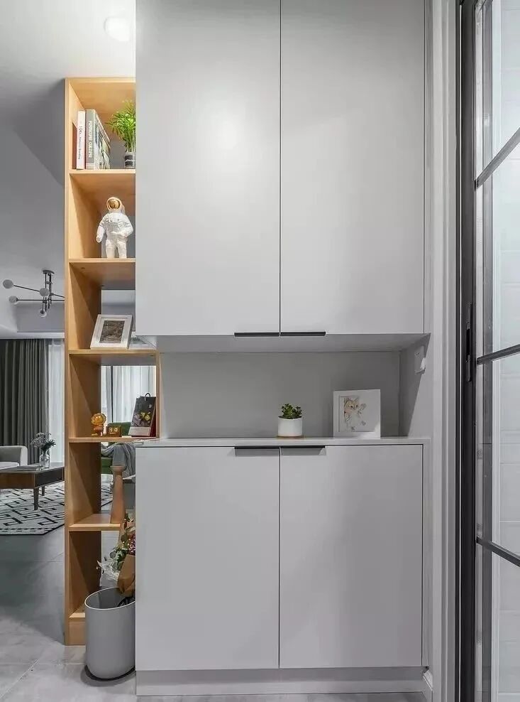 考虑到女士的高跟鞋比较占地方,相对来说男士的鞋子比较的节约空间,鞋柜的分区,增加了空间的利用率,这样可以更充分地利用垂直空间。