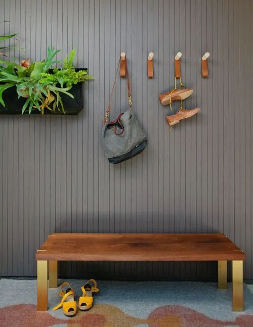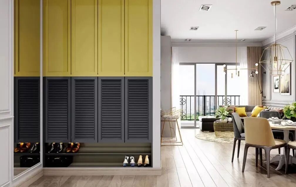 为了减少鞋子味道的尴尬,鞋柜的门做成了百叶窗的形式,做成不同的风格,放不同季节的鞋子。