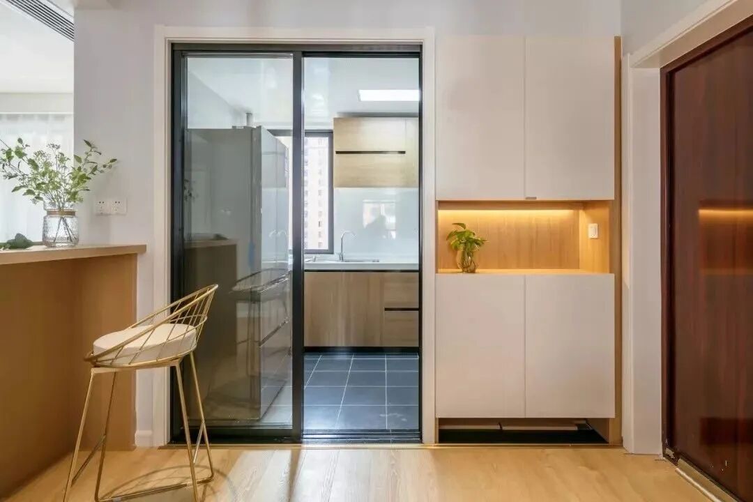 但是,并不是每一种户型都适合用鞋柜来当玄关,也不是每个户型都可以用这种方法来化解尴尬,不是每一种开门见厅的户型,都可以通过设计一个假玄关来化解的。有些客餐厅连在一起的户型,有很强的空间感,可以贴墙设计一整排柜子,这样不仅实用,而且非常节省空间。