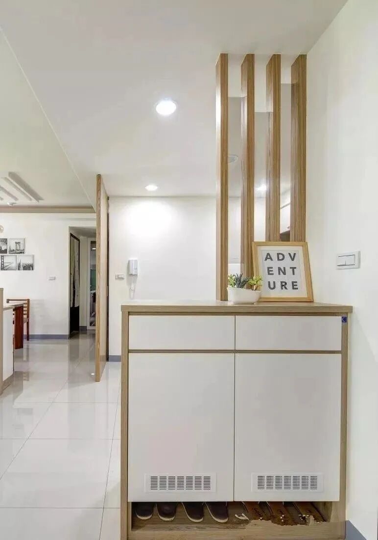 大部分户型,一进门就是客厅或者是餐厅,但是门框和垂直墙面之间会拥有一定的地方,在这个空余的位置就可以摆放一个鞋柜,非常的方便,而且整洁。