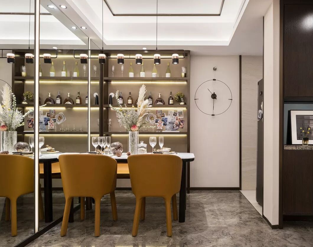 中式传统配色哲学被设计师巧妙地运用于餐厅空间,柔和的青白、内敛的黛绿、沉郁的黑、贵雅的红,恰到好处地构设出优雅气质,舒怡、自然,赋予生活一种清逸滋味。