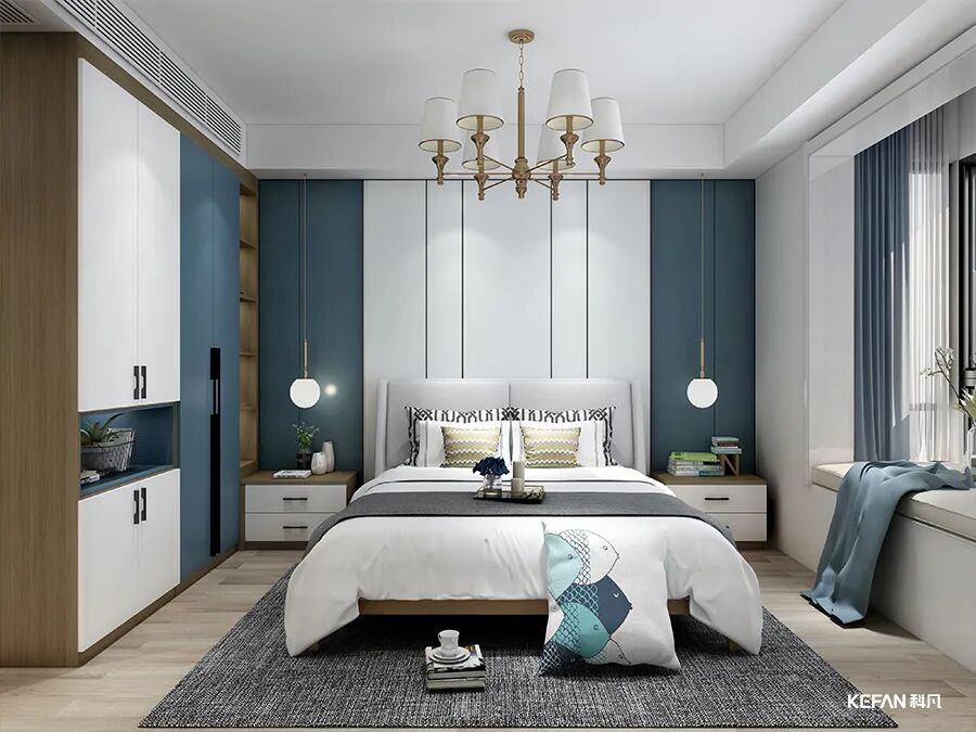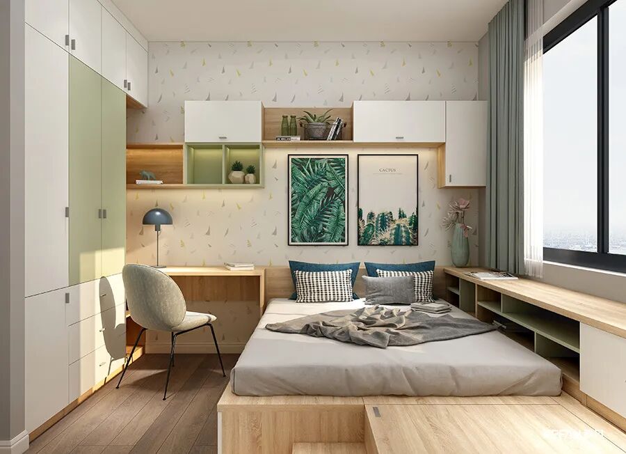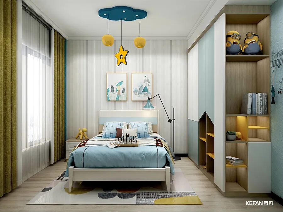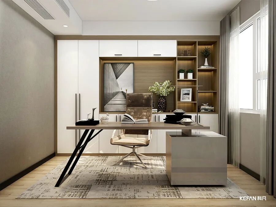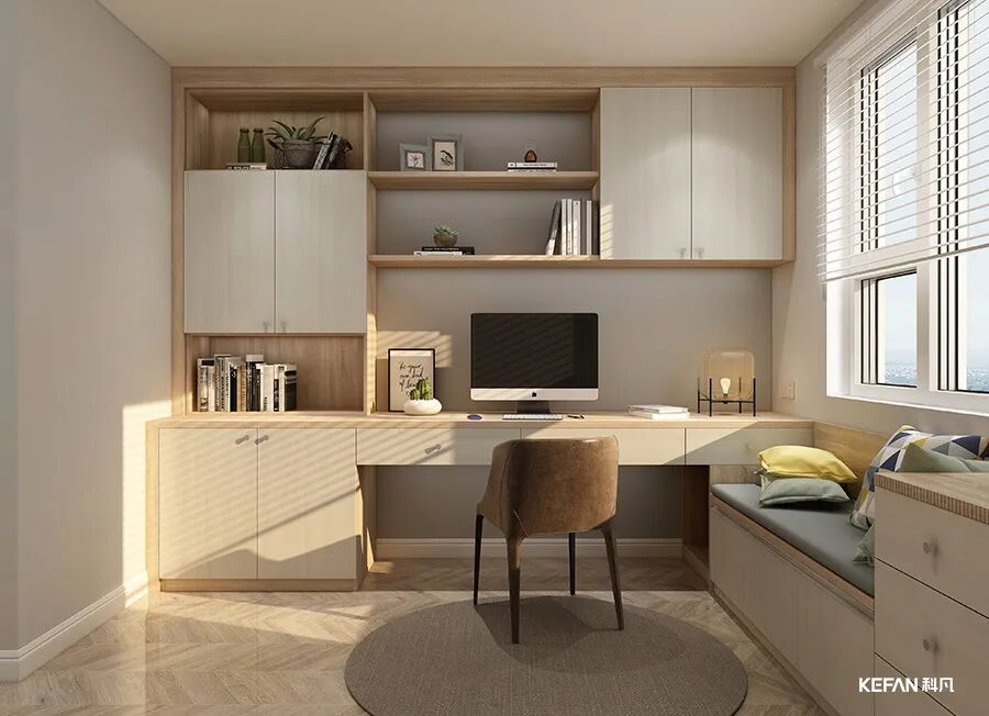 线条构筑框架,突出空间的主体,浅木纹的掩门柜,细腻的投影,书本的重叠,赋予更多的层次感。