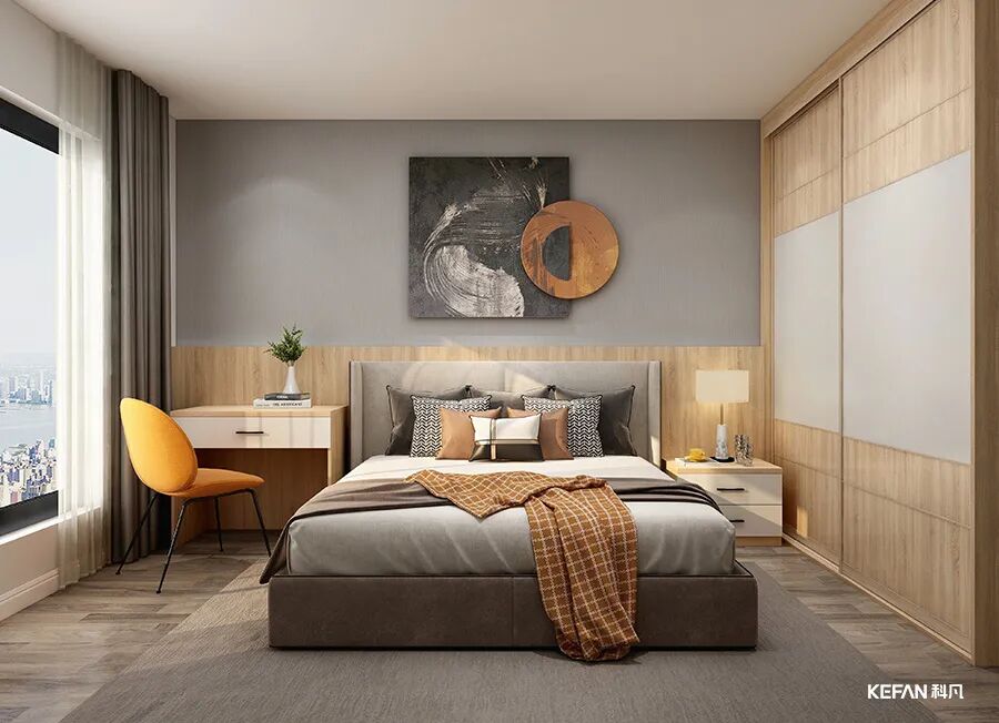 拉开窗帘,是大大的落地窗,阳光照射进原木风的卧室,感受新一天的活力。