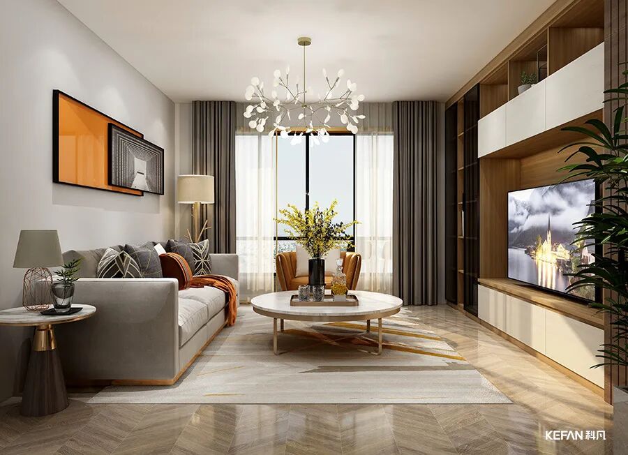 各种材质搭配共同营造出独特的空间质感,石材搭配大理石茶几、铁艺落地灯的组合,创造和谐的有机质感。