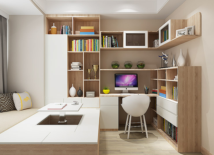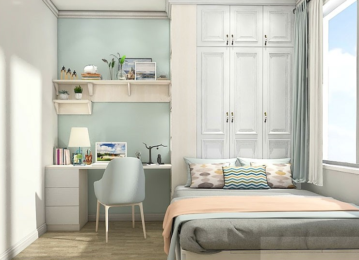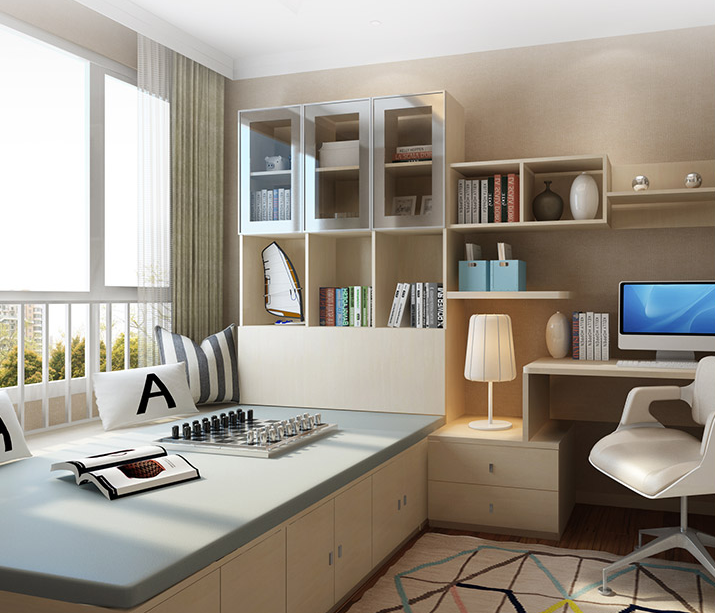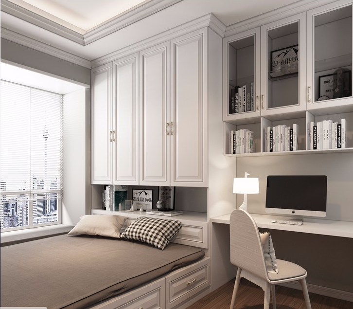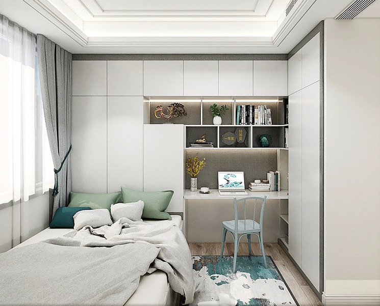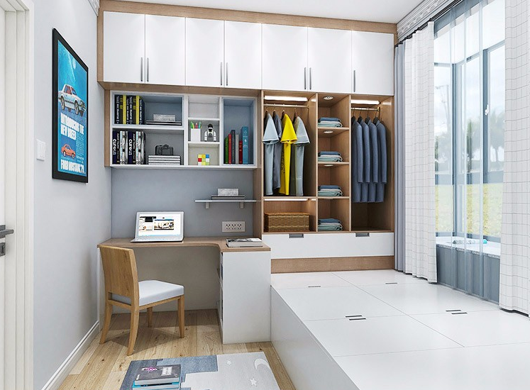 把榻榻米床靠着窗边来摆放,床头或者床尾处改成衣柜,然后房间空余的地方就可以摆放书桌柜了,这样布置只需要不到6平米的空间。